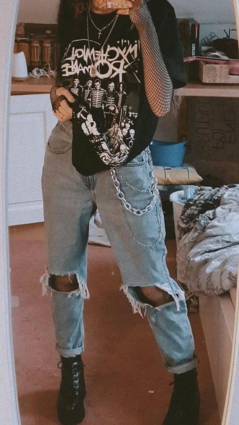 The rips and tears in the denim add an edgy, lived-in feel thats quintessentially grunge. Completing the look are chunky black combat boots, ideal for moshing or standing for hours at a show.