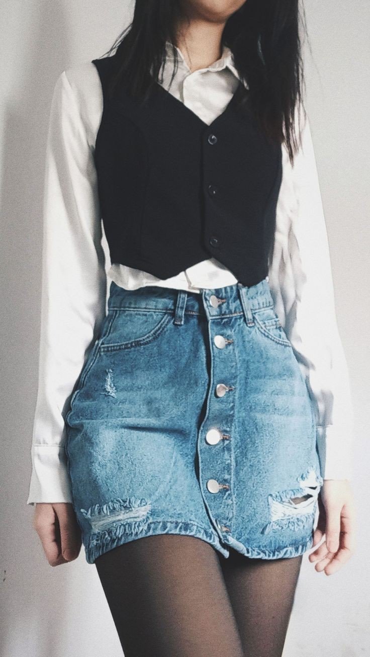 This outfit perfectly encapsulates the 90s grunge aesthetic with a modern twist. The distressed button-front denim skirt is a quintessential grunge piece, featuring raw hems and strategically placed rips that add an edgy, lived-in vibe.