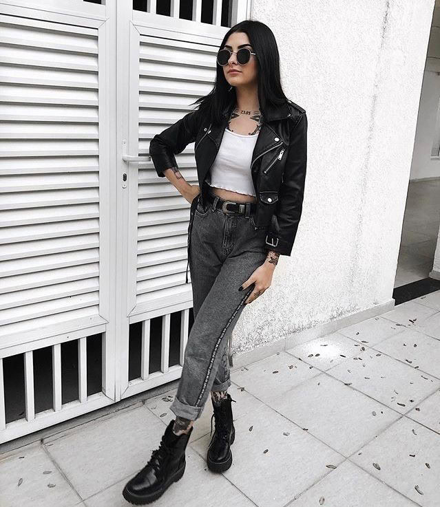This outfit perfectly encapsulates the edgy, rebellious spirit of 90s grunge with a modern twist. The classic black leather jacket, a staple of rock culture, is paired with high-waisted, slightly distressed gray jeans for that authentic lived-in look.