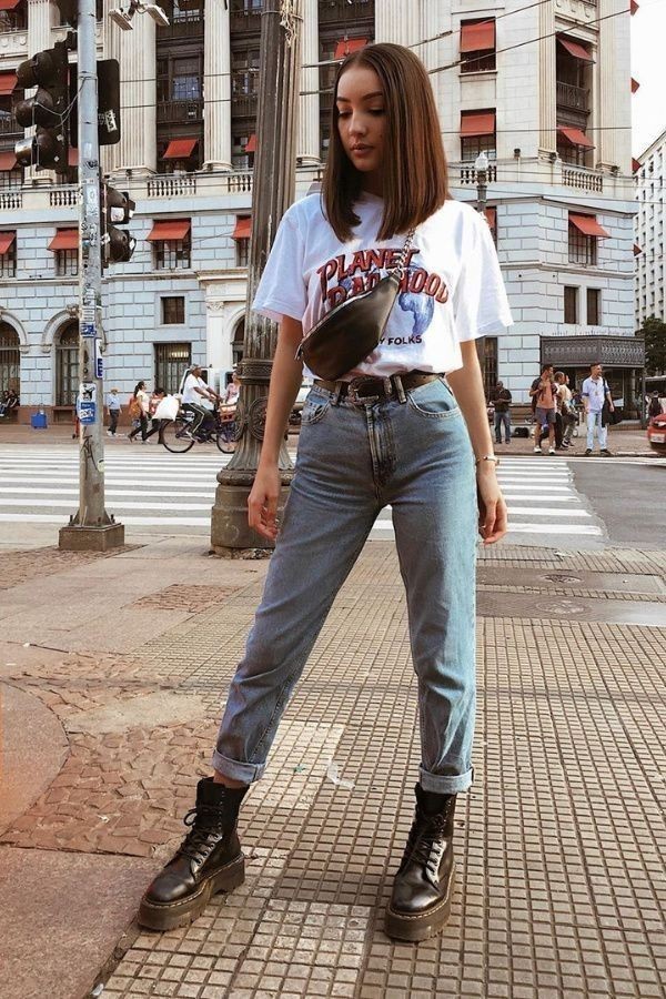 Paired with high-waisted, light-wash jeans, it creates that effortlessly cool vibe iconic to grunge fashion. The look is completed with chunky black combat boots, adding an edgy touch thats both practical and stylish.