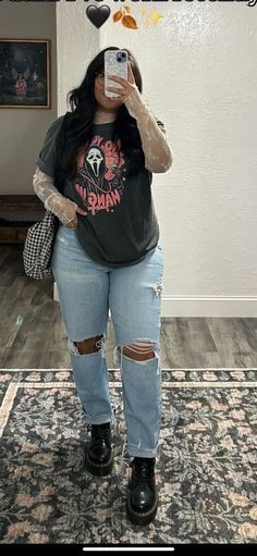 This outfit perfectly captures the essence of 90s grunge with a modern twist. The centerpiece is a worn-in horror movie graphic tee, featuring the iconic Scream mask, which adds an edgy, cult-classic vibe.
