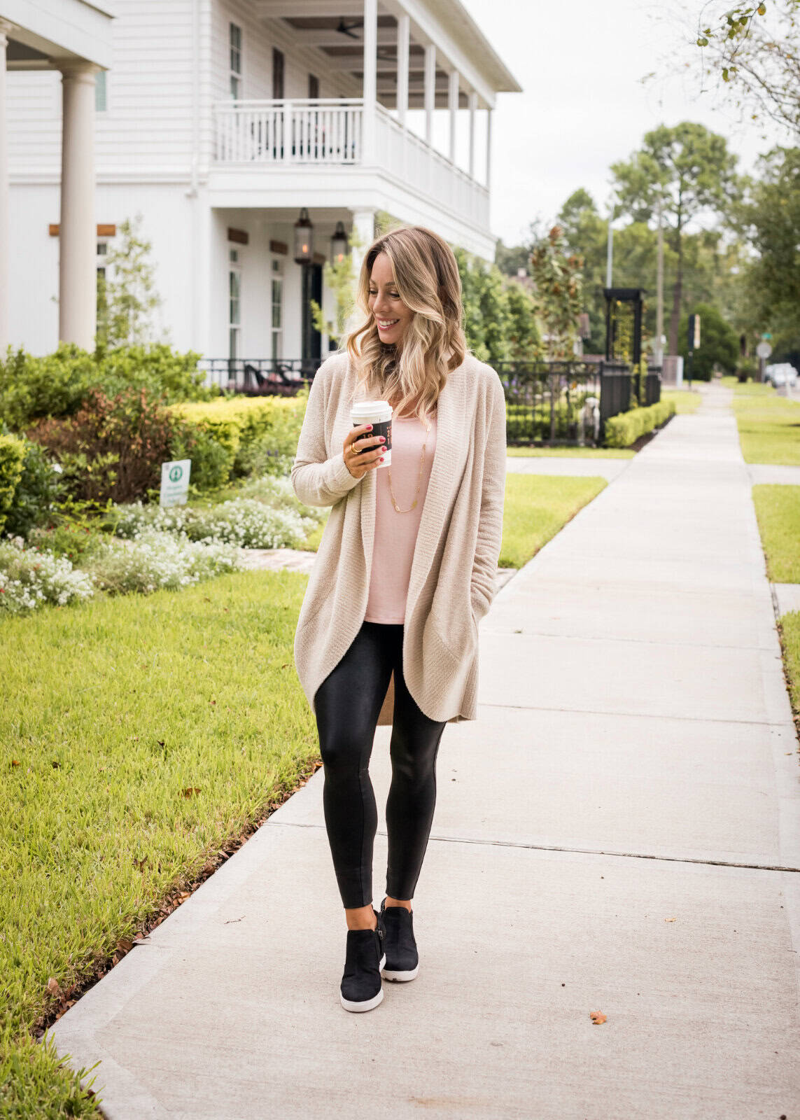 Paired with sleek black leggings and comfortable sneakers, this outfit strikes the ideal balance between cozy and put-together. The layered approach allows for easy adaptation to changing temperatures, while the neutral color palette exudes a calm, seasonal vibe.