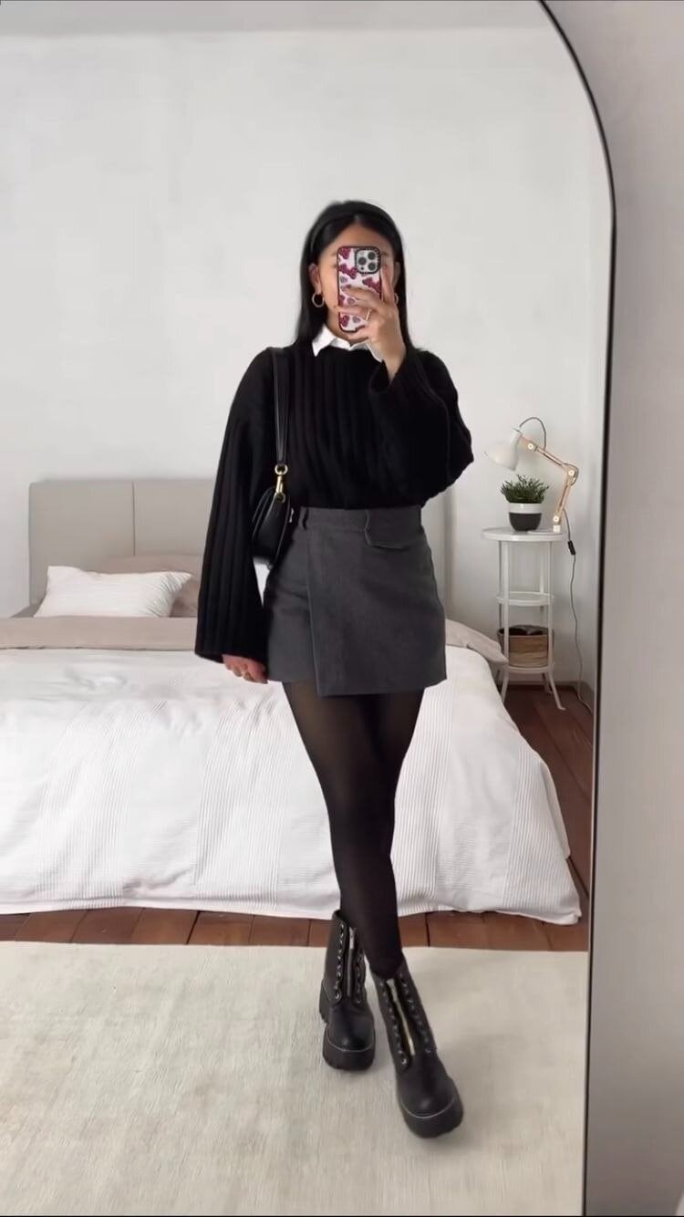 Elevate your autumn style with this sophisticated monochrome ensemble that seamlessly blends comfort and elegance. The outfit features a voluminous black sweater layered over a crisp white collar, creating a striking contrast that draws the eye. A sleek gray mini skirt adds a touch of professionalism, while black tights and chunky ankle boots complete the look with an edgy flair. This versatile combination is perfect for transitioning from office to after-work drinks, embodying the essence of fall fashion. The addition of a small black handbag and subtle gold hoop earrings demonstrates how accessories can enhance a simple color palette, making this outfit a must-have for your autumn wardrobe.