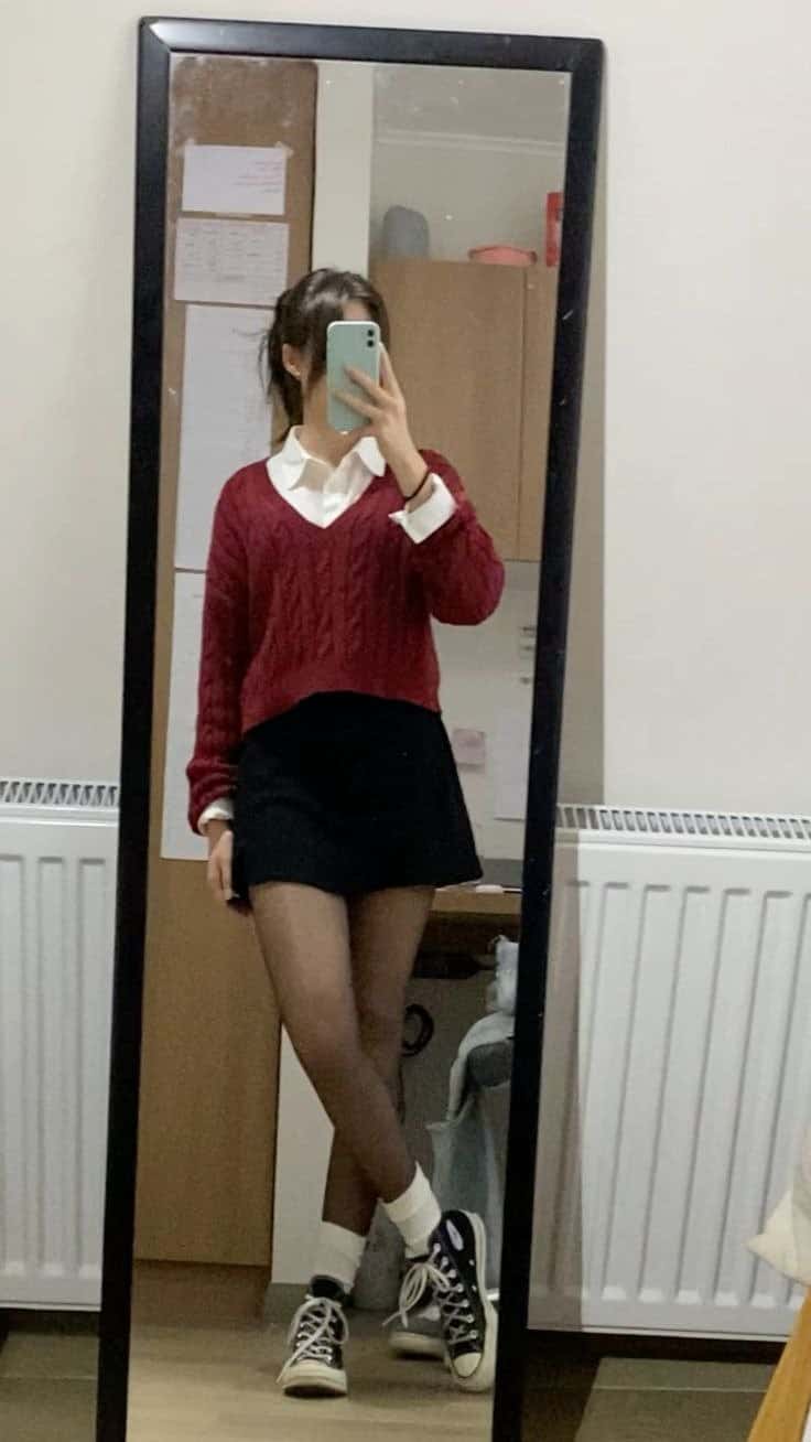 Elevate your autumn style with this effortlessly chic ensemble that perfectly balances comfort and sophistication. The deep burgundy cable-knit sweater layered over a crisp white collared shirt creates a classic preppy look that’s ideal for fall. Paired with a black mini skirt, the outfit offers a playful yet polished vibe. White ankle socks and canvas sneakers add a youthful touch, making this look versatile for both casual outings and semi-formal occasions. This combination showcases how to transition summer pieces into fall by incorporating rich, warm colors and cozy textures. It’s a testament to the power of layering in creating a jaw-dropping autumn outfit that’s both stylish and practical.