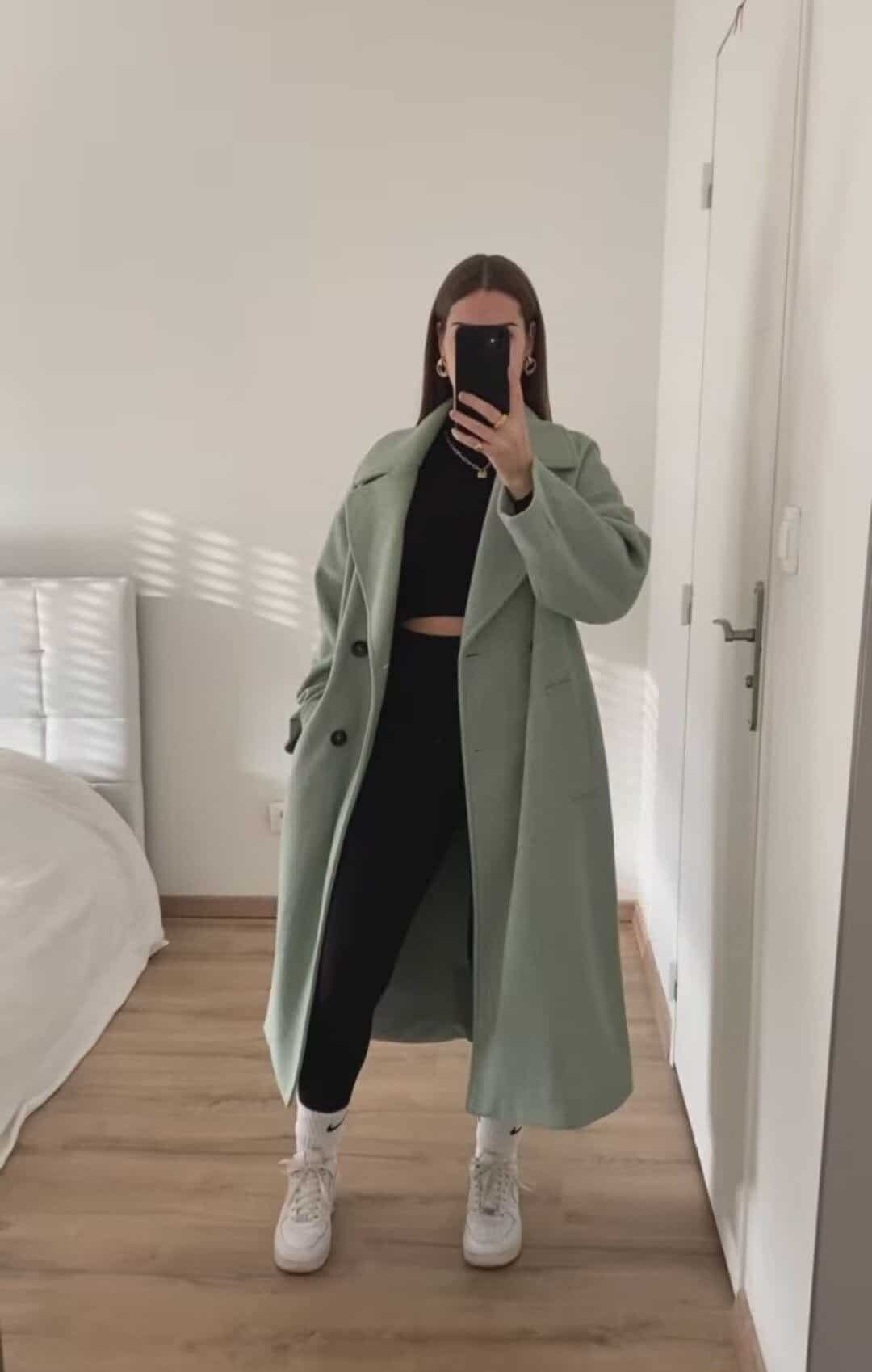 Elevate your autumn style with this unexpected blend of comfort and sophistication. A long, sage green coat adds a touch of elegance to a casual black athleisure ensemble, creating a perfect balance between cozy and chic. The muted green hue captures the essence of fall while providing a refreshing alternative to traditional autumn colors. This look demonstrates how to seamlessly incorporate trendy outerwear into your everyday wardrobe, making it ideal for running errands or meeting friends for coffee. The combination of the structured coat with relaxed sportswear and crisp white sneakers offers a modern, street-style-inspired outfit that’s both practical and fashion-forward for the cooler months.