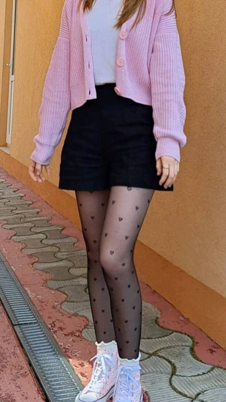 Elevate your autumn style with this charming and playful ensemble that perfectly balances cozy comfort with a touch of whimsy. The soft, ribbed pastel pink cardigan adds a delightful pop of color to your fall wardrobe, while its chunky knit texture provides warmth for those crisp autumn days. Paired with a classic white top and black mini skirt, this outfit creates a versatile base for experimentation. The star of the show, however, is the heart-patterned sheer tights, which add an unexpected and flirtatious element to the look. Finished off with white sneakers, this outfit strikes the perfect balance between cute and casual, making it an ideal choice for everything from pumpkin patch visits to coffee dates with friends.