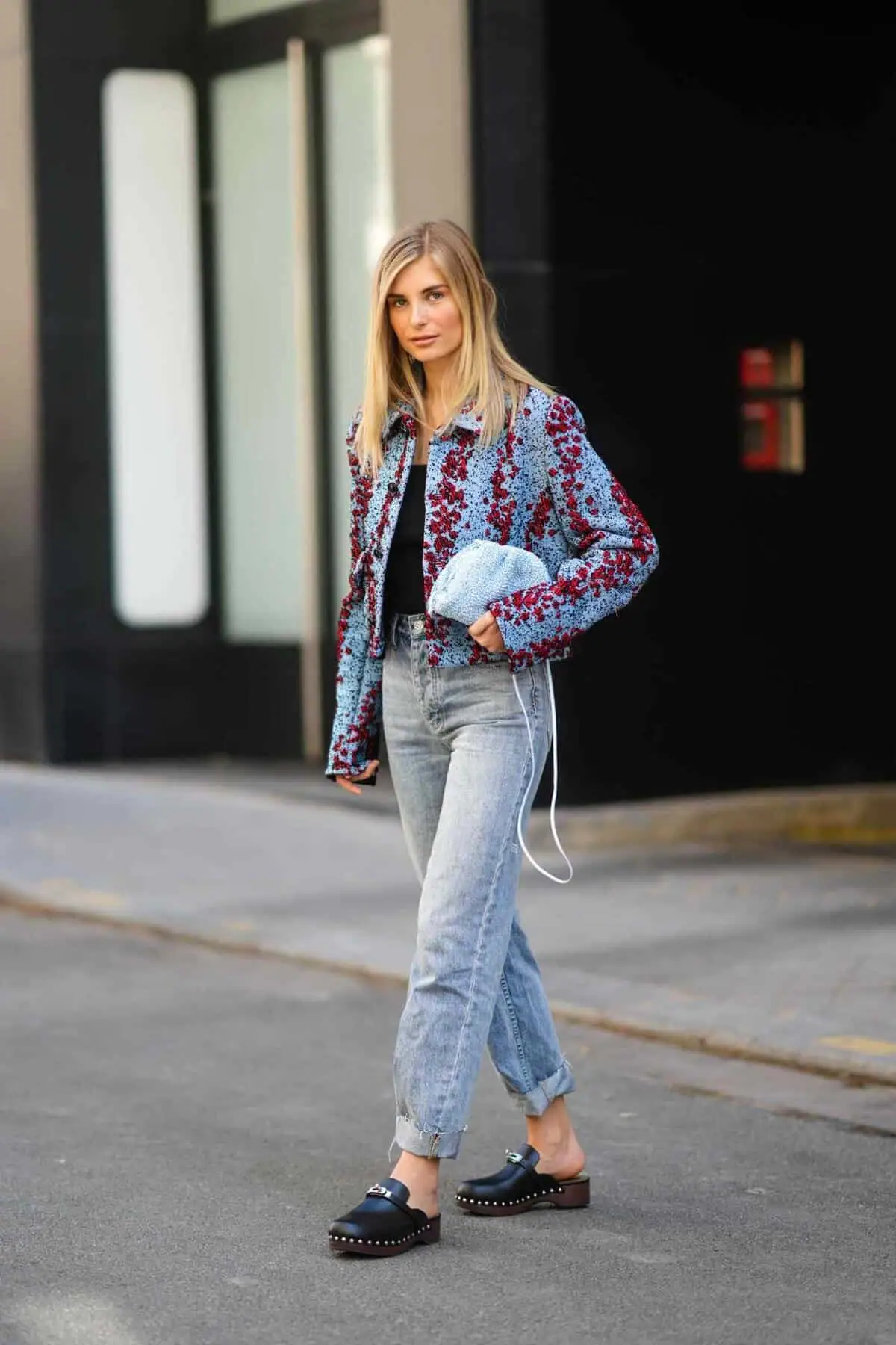 Paired with relaxed-fit light wash jeans, this look strikes the perfect balance between casual and chic. The black slip-on clogs offer both style and comfort, ideal for long days of lectures and campus activities.