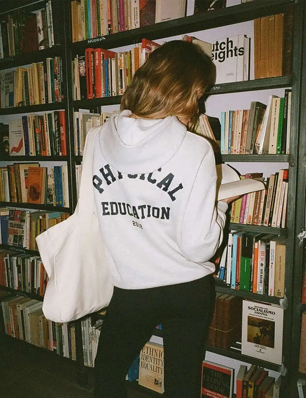When it comes to effortless campus style, nothing beats a classic college hoodie. This white Physical Education sweatshirt perfectly embodies the collegiate aesthetic while providing ultimate comfort for those long study sessions in the library.
