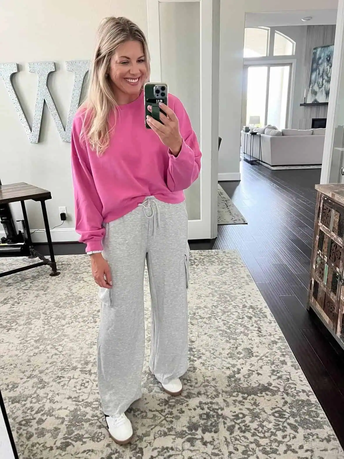 This vibrant pink sweatshirt paired with relaxed gray lounge pants is the epitome of comfortable college style. The oversized sweatshirt offers warmth and coziness for those long study sessions, while the wide-leg pants provide ultimate comfort and ease of movement.