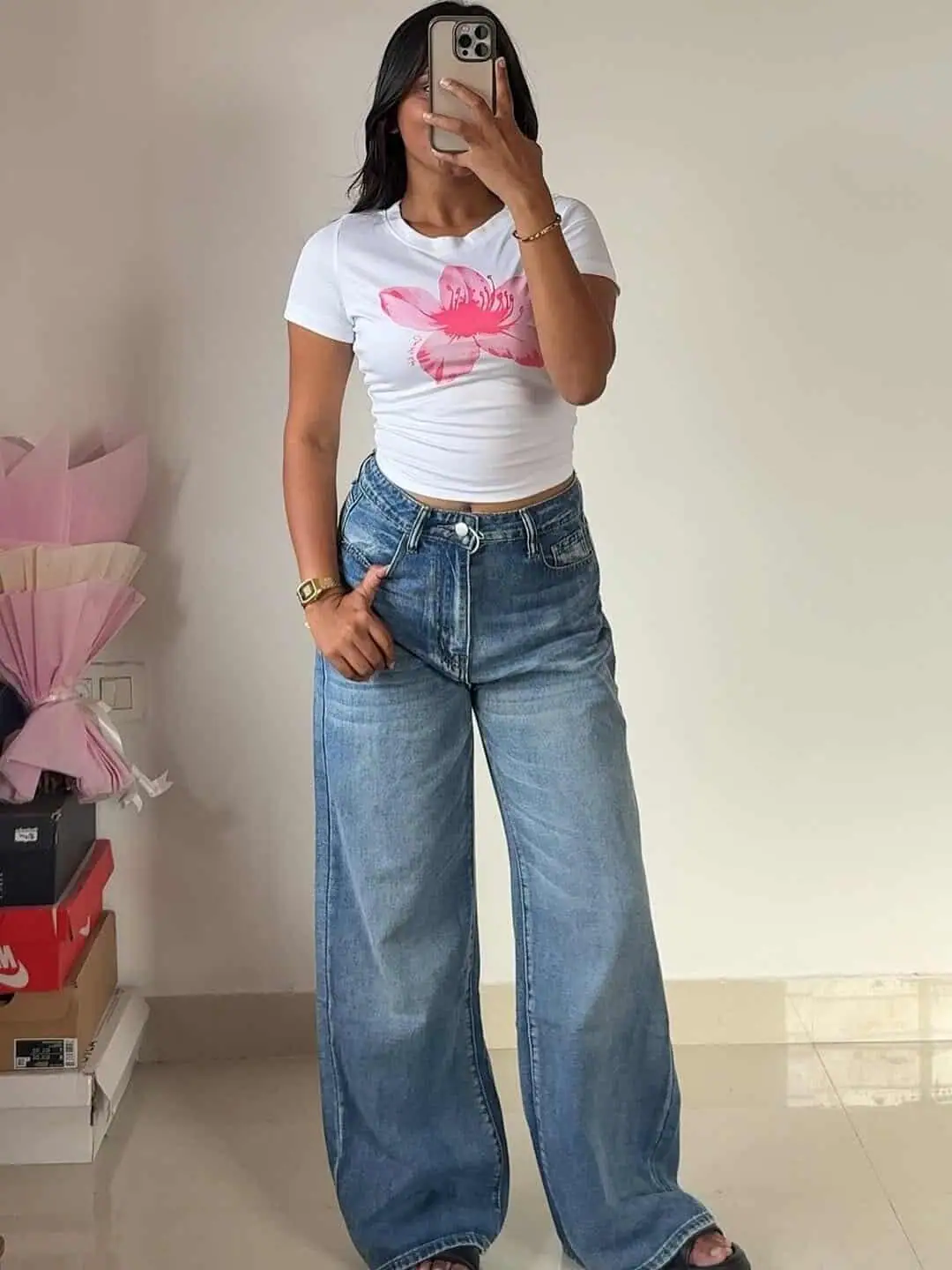 Embrace comfort and style with this classic combo of a white floral tee and wide-leg jeans. The fitted crop top featuring a vibrant pink flower print adds a touch of femininity, while the relaxed denim bottoms offer maximum comfort for long days on campus.