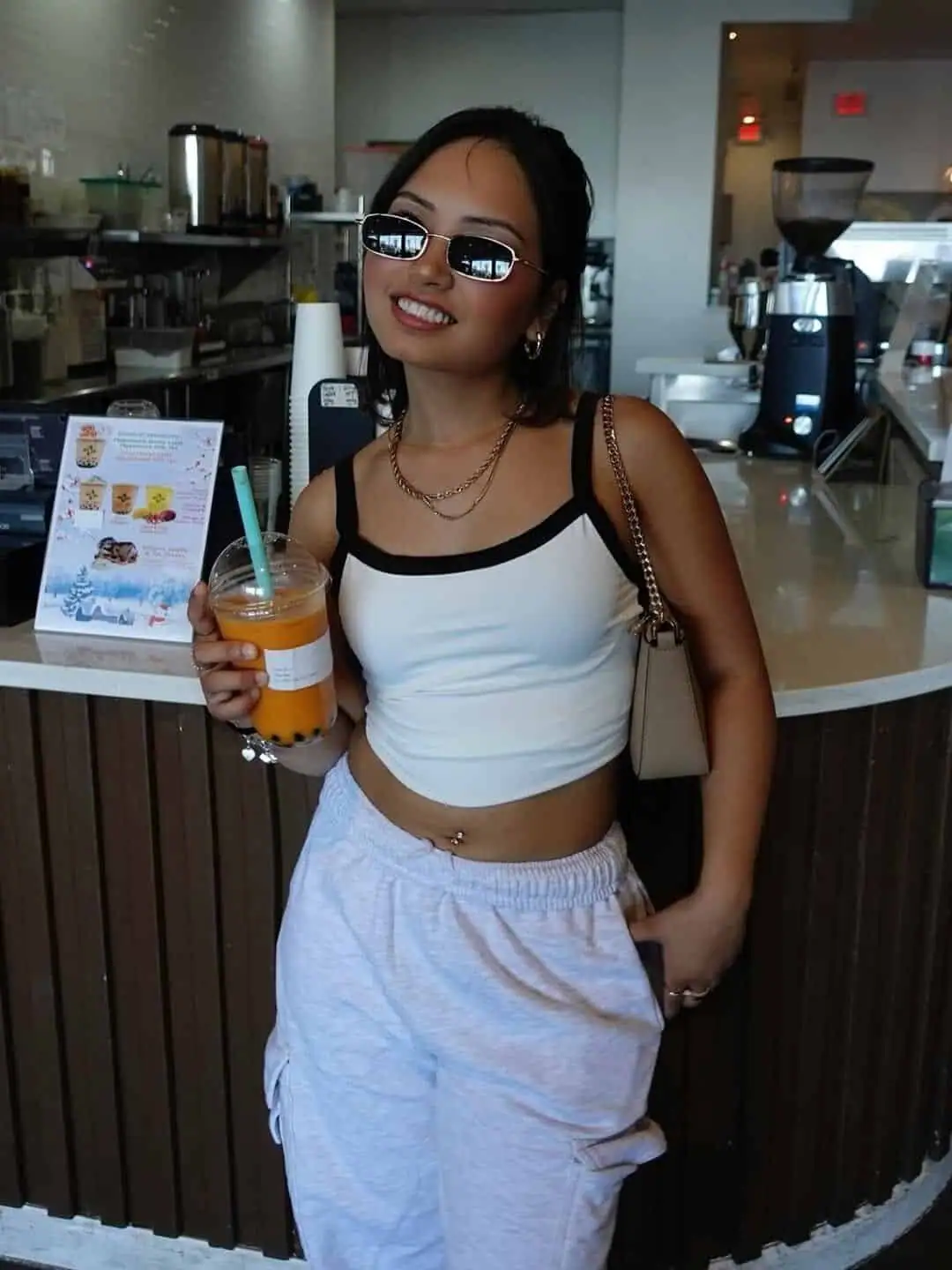 This effortlessly chic ensemble combines comfort and style, perfect for those long days on campus. The white crop top with black trim offers a clean, minimalist look that pairs seamlessly with light grey sweatpants.