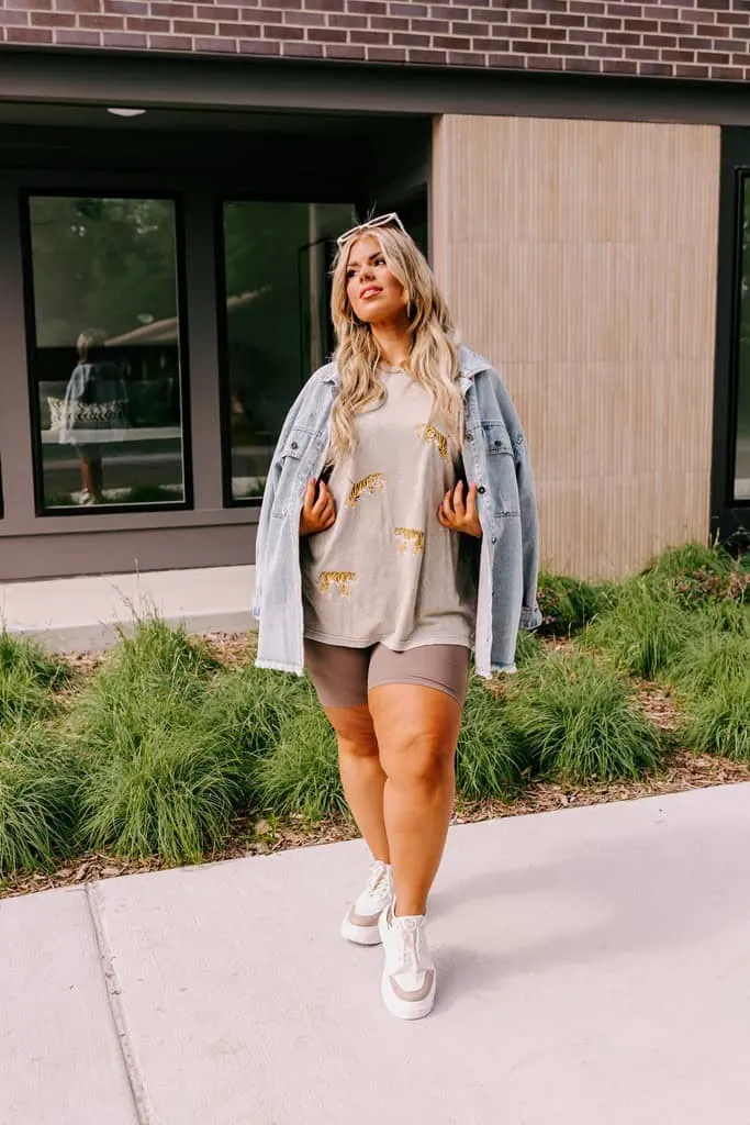 The roomy tee allows for unrestricted movement, while the bike shorts offer coverage and support. Layered with a light denim jacket, this outfit transitions seamlessly from early morning classes to afternoon study sessions.