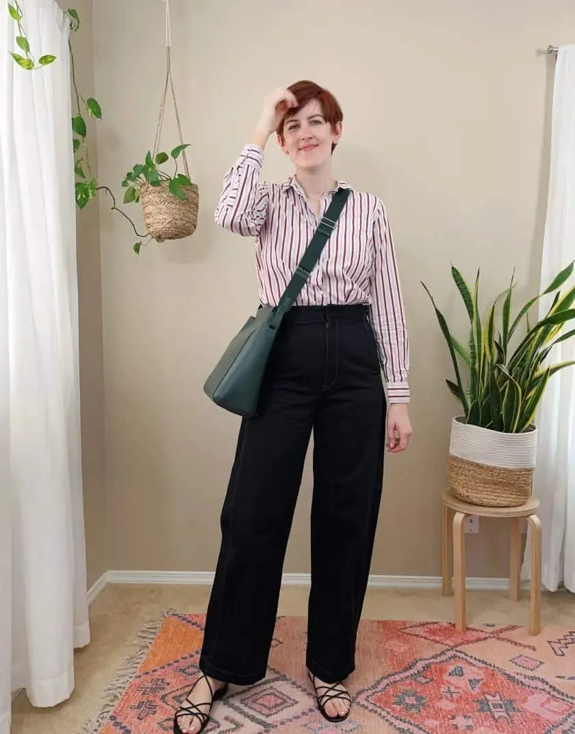 Paired with high-waisted, wide-leg pants, this outfit offers both polish and practicality. The roomy silhouette of the pants allows for easy movement between classes, while the dark color is versatile and hides potential spills.