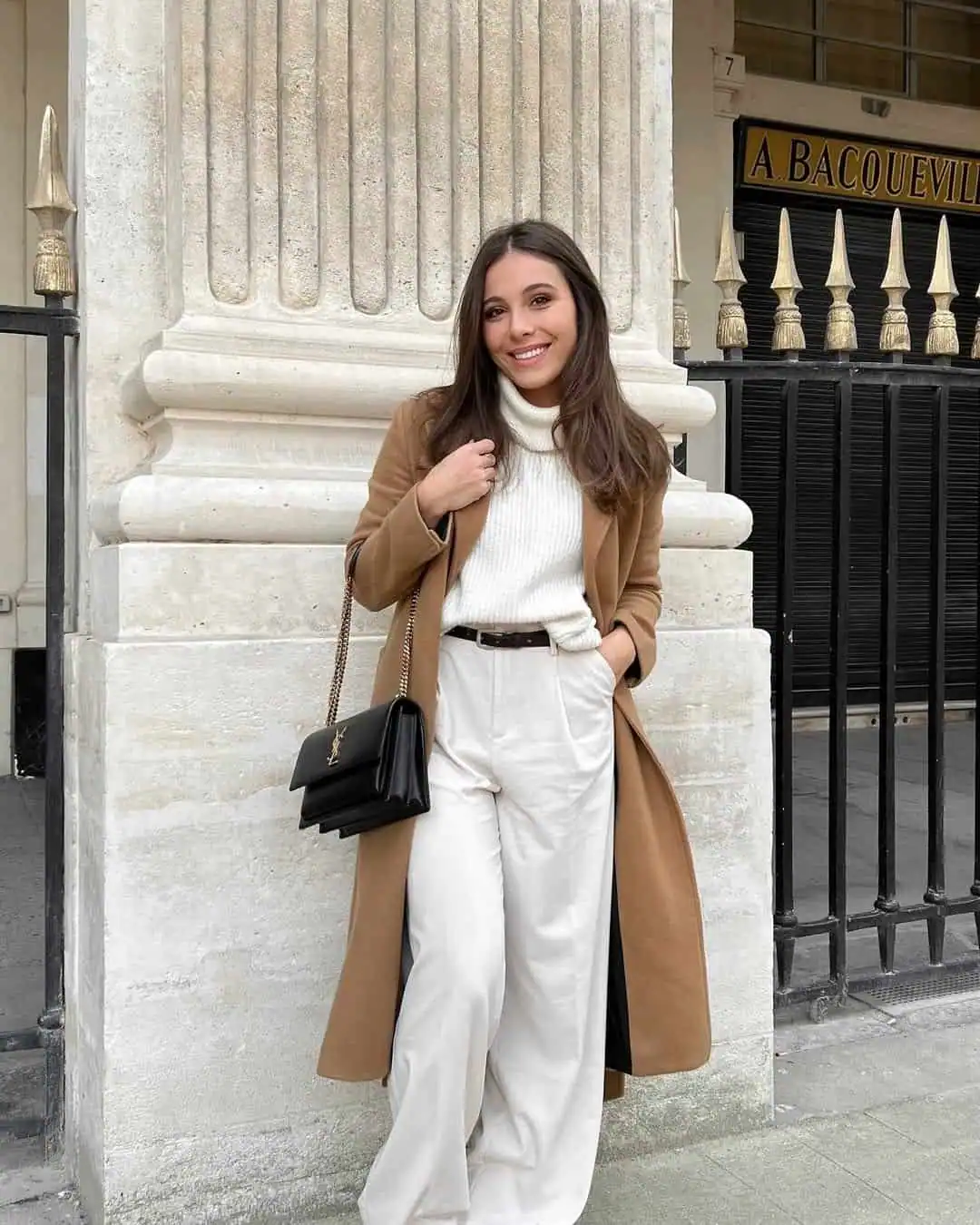 Elevate your campus style with this chic and cozy ensemble. A classic camel coat paired with a crisp white turtleneck sweater offers both warmth and sophistication for those chilly lecture hall mornings.