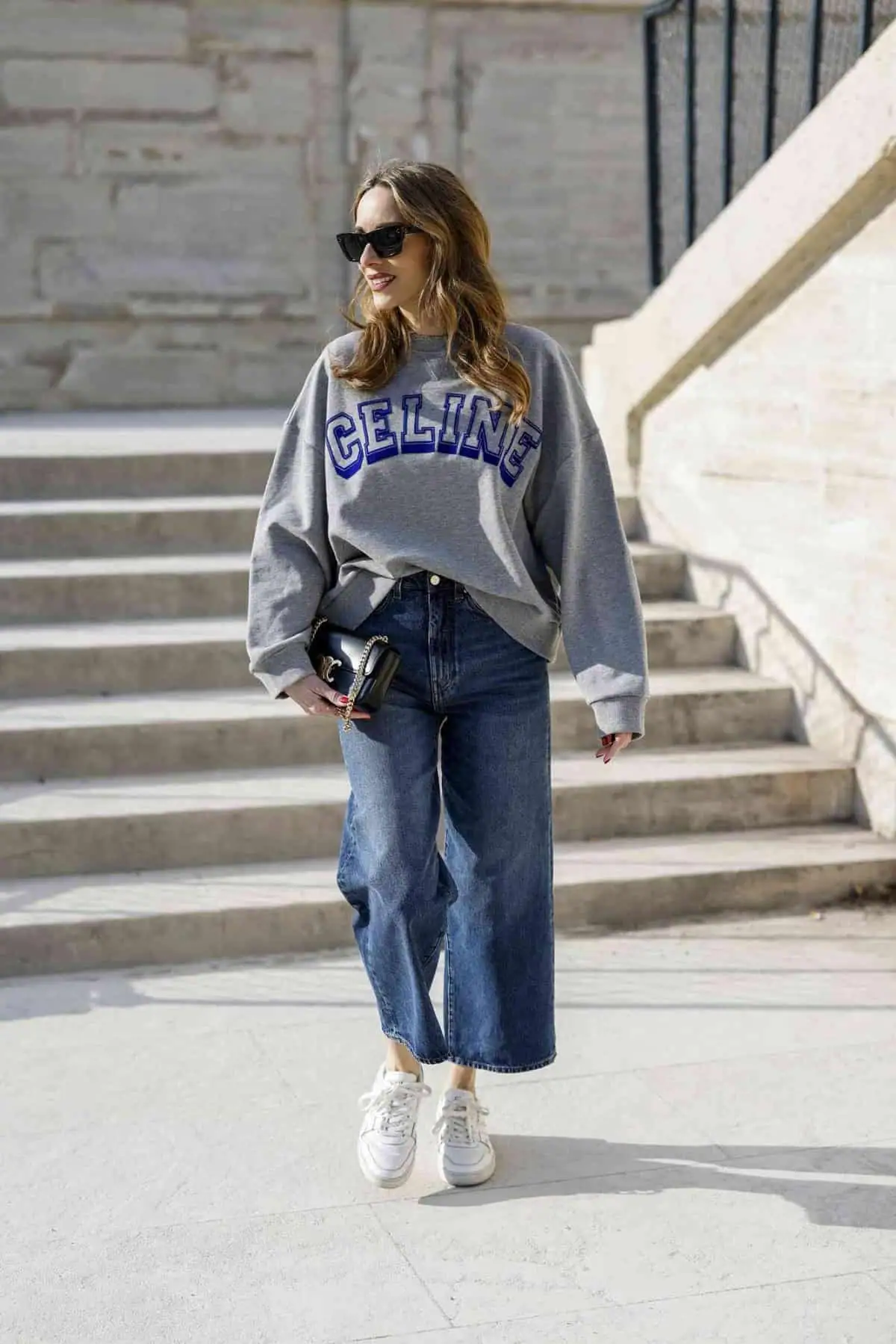 Embrace campus comfort with this effortlessly chic ensemble. The oversized gray sweatshirt, featuring bold blue lettering, offers both style and coziness for those long study sessions.