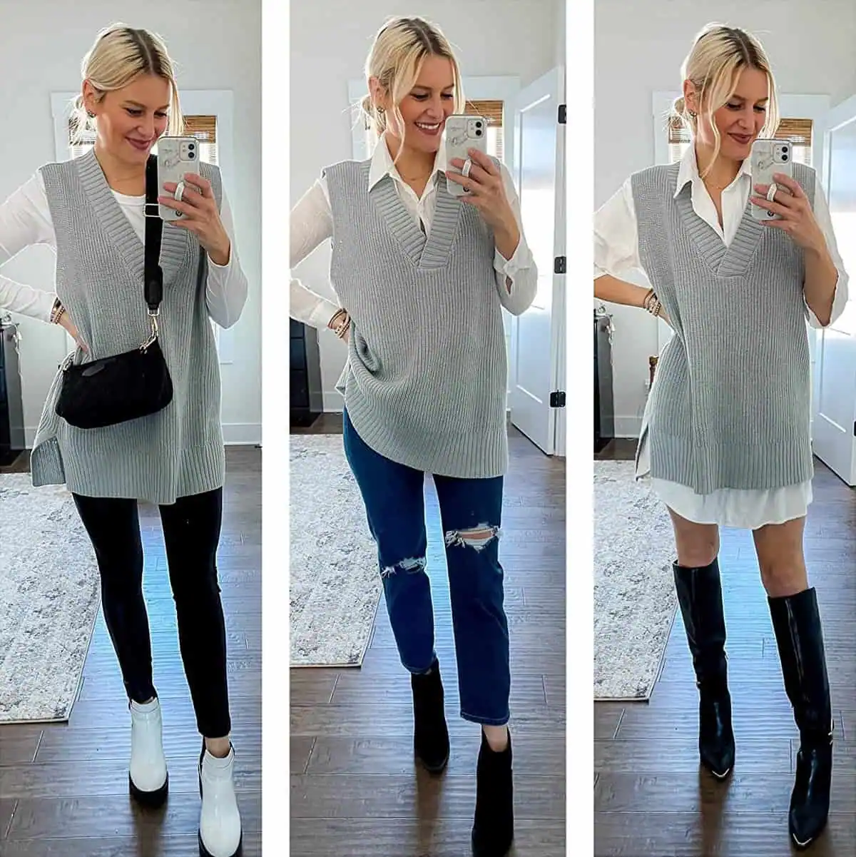 This gray sweater vest ensemble is a college wardrobe essential, offering versatility and comfort for busy campus life. The ribbed knit vest can be styled multiple ways over a crisp white shirt for a preppy look, paired with distressed jeans for a casual vibe, or layered over a shirt dress for a chic twist.