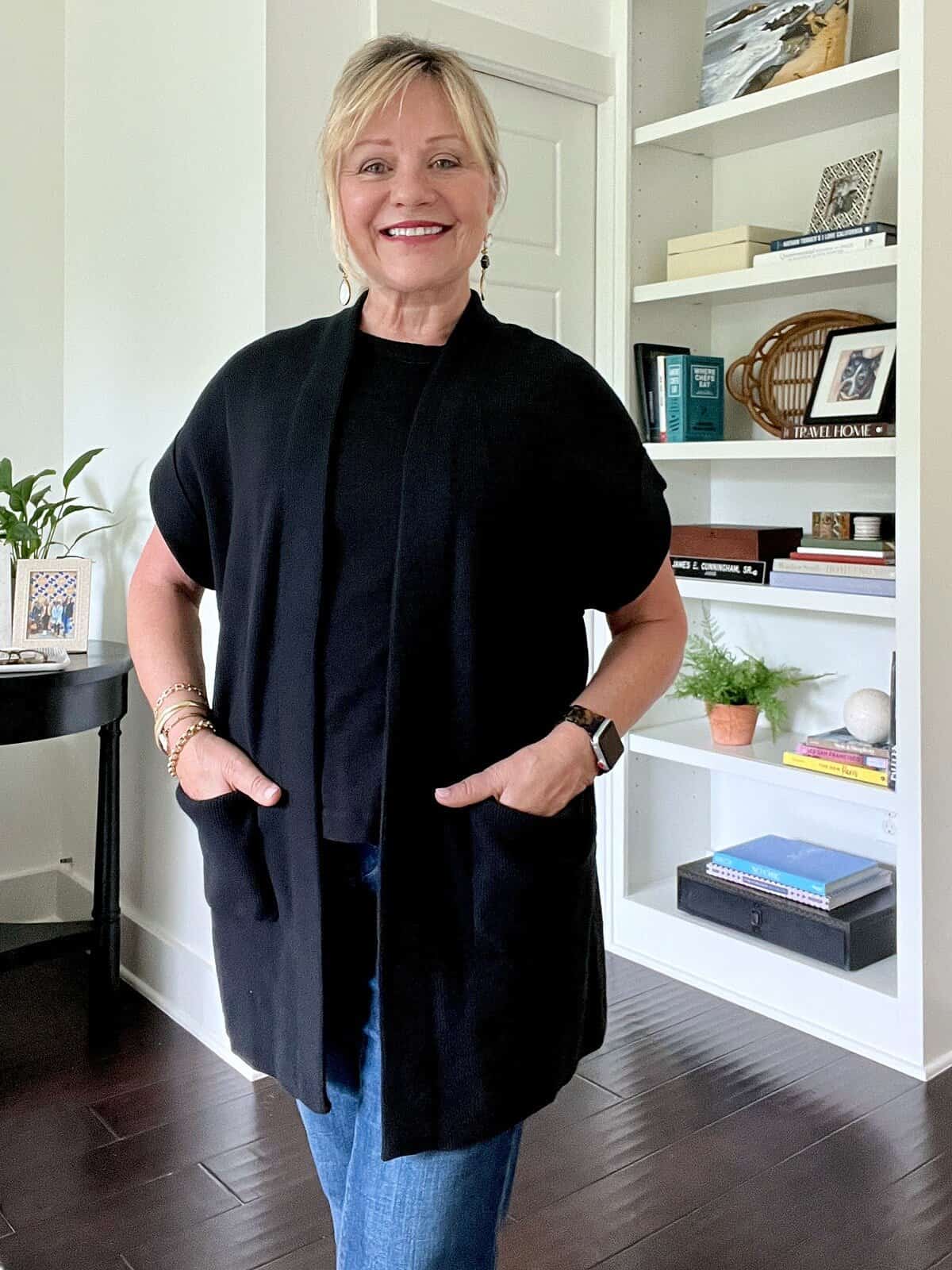 Elevate your casual fall style with this effortlessly chic combination of a black cardigan and denim jeans. The oversized, draping cardigan adds a touch of sophistication to the classic jeans, creating a perfect balance between comfort and elegance. This versatile outfit works for various occasions, from a coffee run to a casual dinner with friends. The black cardigan serves as an excellent layering piece for unpredictable autumn weather, while the jeans provide a relaxed, everyday vibe. Accessorize with statement earrings and delicate bracelets to complete this polished yet laid-back look that’s sure to become a go-to ensemble in your fall wardrobe.