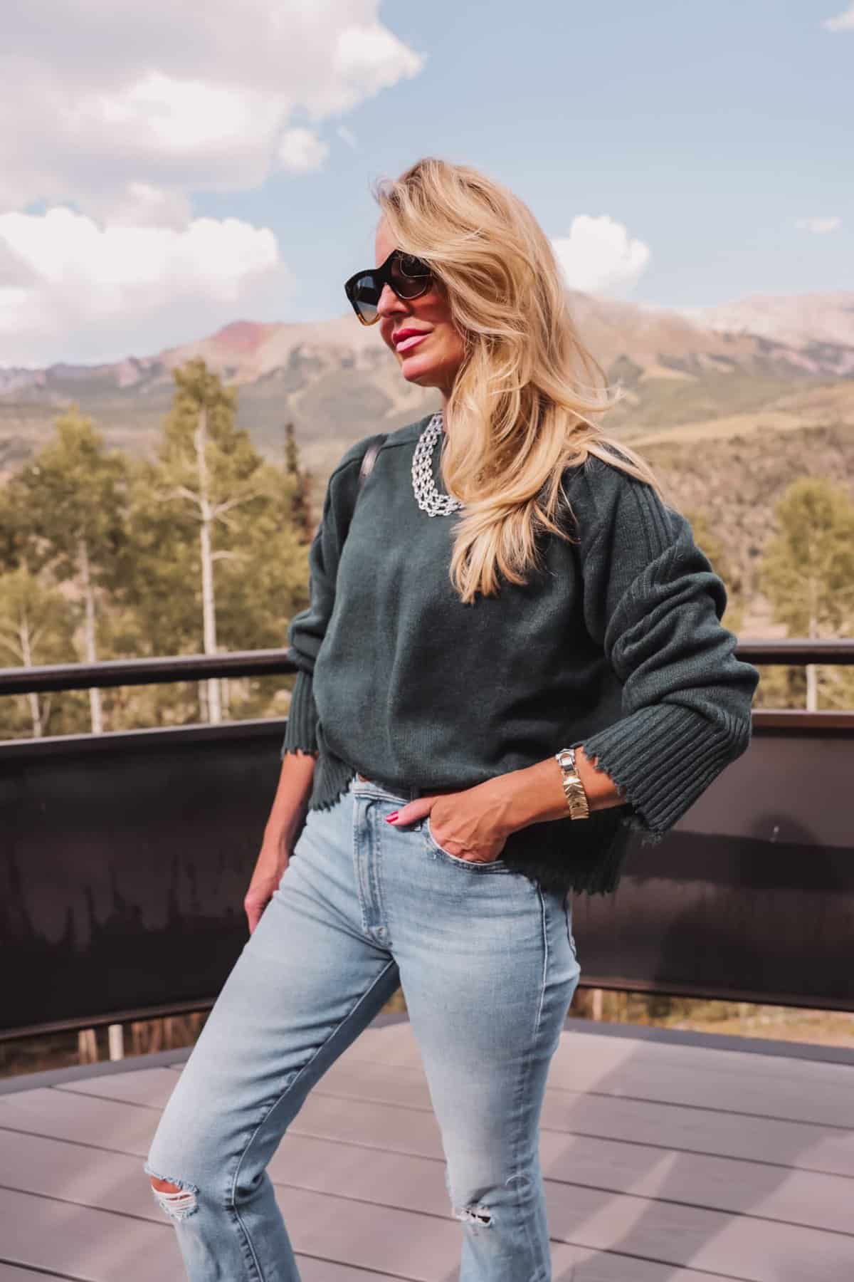 Embrace the crisp autumn air with this effortlessly chic ensemble that perfectly balances comfort and style. The forest green sweater adds a rich, seasonal touch while providing warmth for those cooler fall days. Paired with light-wash distressed jeans, this outfit achieves a relaxed yet put-together look ideal for casual outings. Elevate the ensemble with statement accessories like the eye-catching silver necklace and stylish sunglasses. This combination exemplifies how to transition summer staples into fall by layering them with cozy knits. It’s a versatile look that can easily take you from a mountain retreat to a city café, embodying the essence of casual fall fashion.