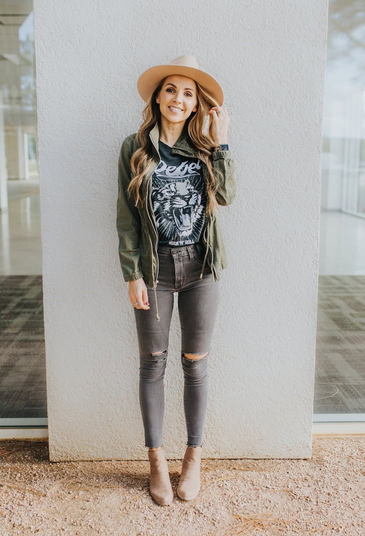Elevate your casual fall style with an edgy yet chic ensemble that perfectly balances comfort and fashion. This outfit combines a rugged olive green utility jacket with a bold graphic tee, creating an eye-catching contrast. The distressed gray skinny jeans add a touch of grunge, while the neutral ankle boots and wide-brimmed hat bring a sophisticated flair to the look. This combination exemplifies how to layer effectively for autumn, mixing textures and styles for a fashion-forward appearance. The utility jacket serves as a versatile piece that can be dressed up or down, making it an essential addition to your fall wardrobe. This outfit idea showcases how to incorporate summer staples into your autumn rotation, ensuring a seamless transition between seasons.