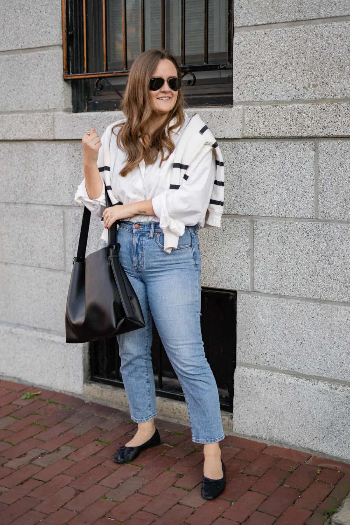 Elevate your casual fall style with this effortlessly chic ensemble. The oversized white cardigan with bold black stripes adds a cozy layer perfect for crisp autumn days, while the classic blue jeans provide a timeless foundation. The combination strikes an ideal balance between comfort and style, making it a versatile choice for various fall activities. Accessorize with sleek black flats and a matching tote for a polished finish. This outfit demonstrates how simple pieces can create a put-together look that’s both trendy and practical for the season. It’s an excellent example of how to transition your wardrobe from summer to fall with ease and elegance.