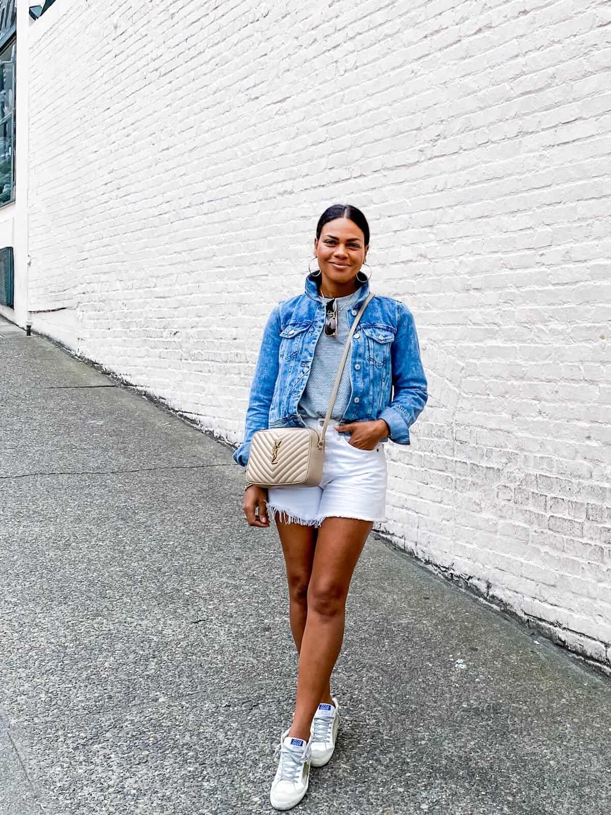 Embrace Seattle’s unpredictable fall weather with this versatile ensemble. The classic denim jacket paired with white shorts offers a perfect transition piece for those mild autumn days in the Pacific Northwest. Layer a light grey sweater underneath for added warmth, and complete the look with comfortable white sneakers for exploring the city. The neutral-toned crossbody bag adds a touch of sophistication while keeping your hands free. This outfit seamlessly blends casual comfort with urban chic, making it ideal for everything from coffee runs to weekend farmers’ market visits. It’s a great way to extend your summer wardrobe into the fall season while staying true to Seattle’s laid-back style.