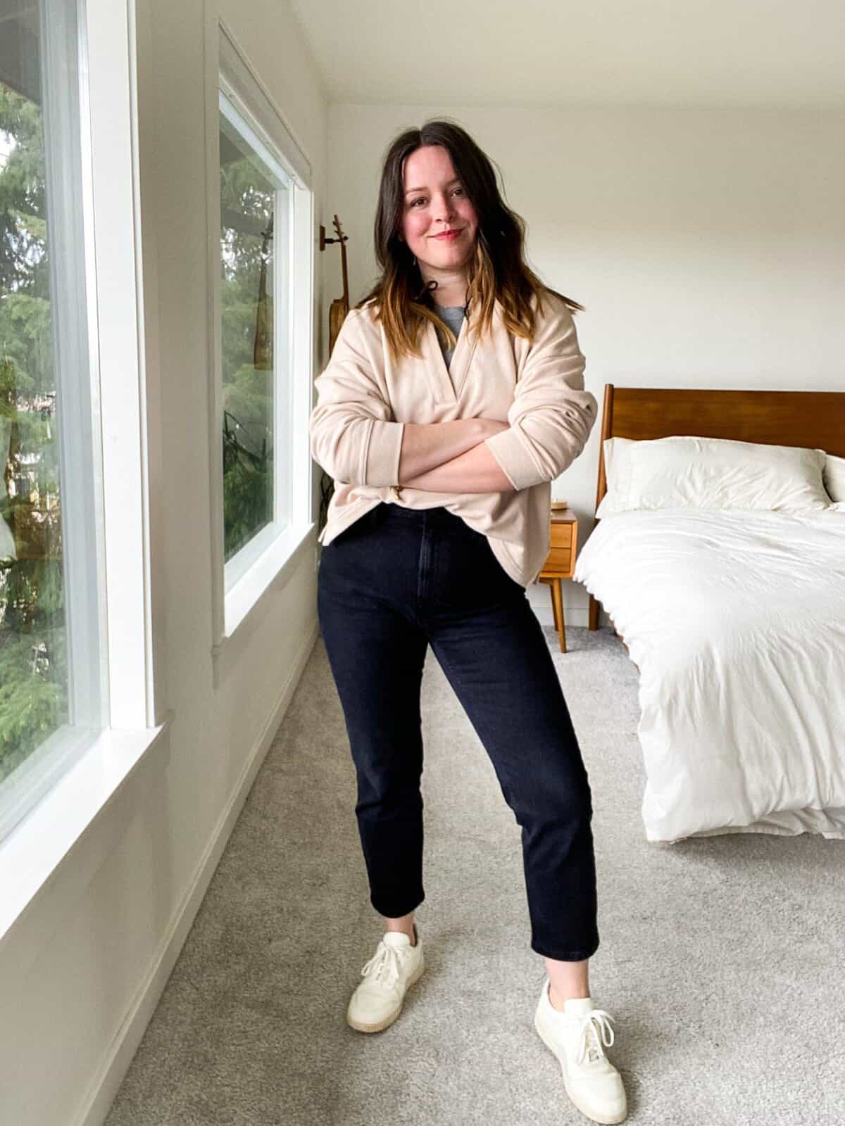 Embrace the perfect balance of comfort and style with this versatile Seattle fall outfit. The cream-colored blazer adds a touch of sophistication while keeping you cozy on crisp autumn days. Paired with dark denim jeans, this ensemble offers a classic yet modern look that’s ideal for navigating the city’s unpredictable weather. The neutral tones reflect the Pacific Northwest’s subdued palette, while the casual sneakers ensure you’re ready for impromptu coffee runs or leisurely strolls through colorful foliage. This outfit embodies the laid-back yet put-together aesthetic that Seattle is known for, making it a must-try for your fall wardrobe.