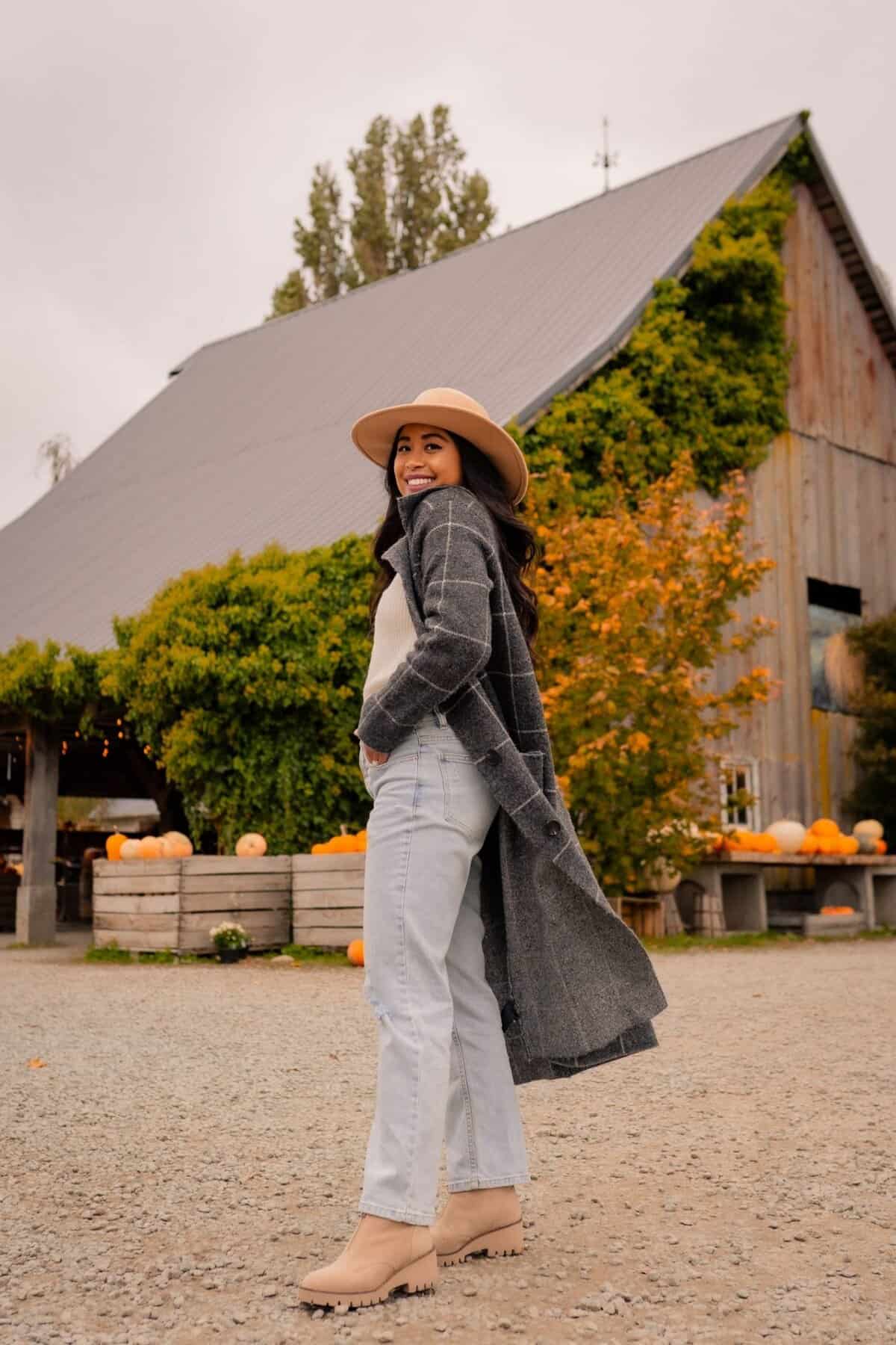 Embrace the essence of Seattle’s urban-rural charm with this versatile fall ensemble. A long, charcoal wool coat adds sophistication and warmth, perfect for those crisp PNW mornings. Pair it with light-wash jeans and a cream sweater for a balanced contrast that works seamlessly from countryside excursions to city adventures. The wide-brim hat in a neutral tone not only shields from autumn drizzles but also adds a touch of effortless style. Chunky beige boots complete the look, offering comfort for pumpkin patch visits while staying on-trend for coffee runs. This outfit embodies the laid-back yet put-together aesthetic that defines Seattle’s fall fashion, making it a must-try for those seeking to capture the city’s unique blend of rustic and metropolitan vibes.