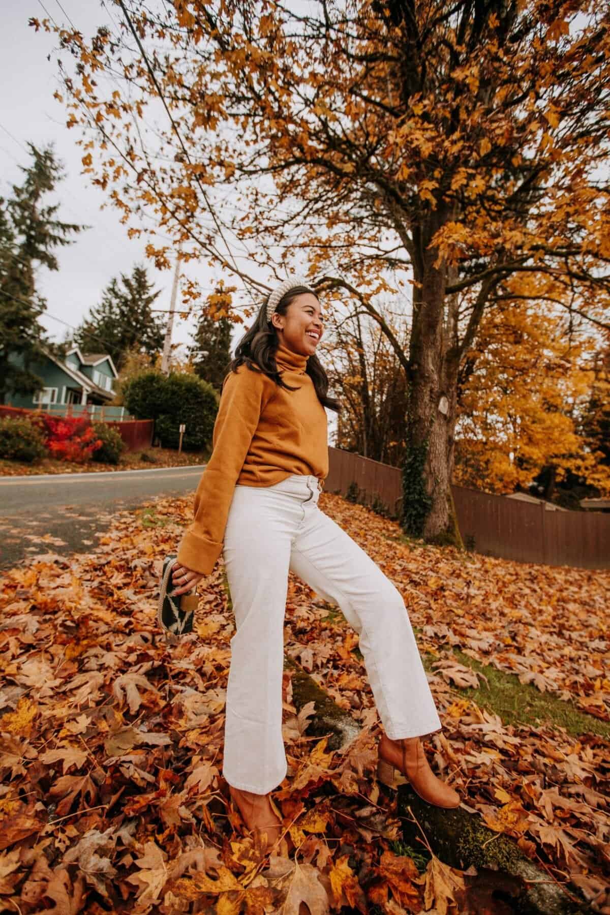 Embrace the crisp Seattle fall with this effortlessly chic ensemble that perfectly balances warmth and style. The mustard turtleneck sweater adds a pop of autumnal color, mirroring the golden leaves cascading around the model. Paired with crisp white wide-leg jeans, this outfit creates a fresh contrast against the rich fall backdrop. The look is completed with cognac ankle boots and a cozy knit headband, ideal for those breezy PNW days. This versatile combination works for a casual coffee run or a relaxed day at the office, embodying the laid-back yet put-together Seattle aesthetic. It’s a must-try for anyone looking to infuse their fall wardrobe with both comfort and seasonal flair.