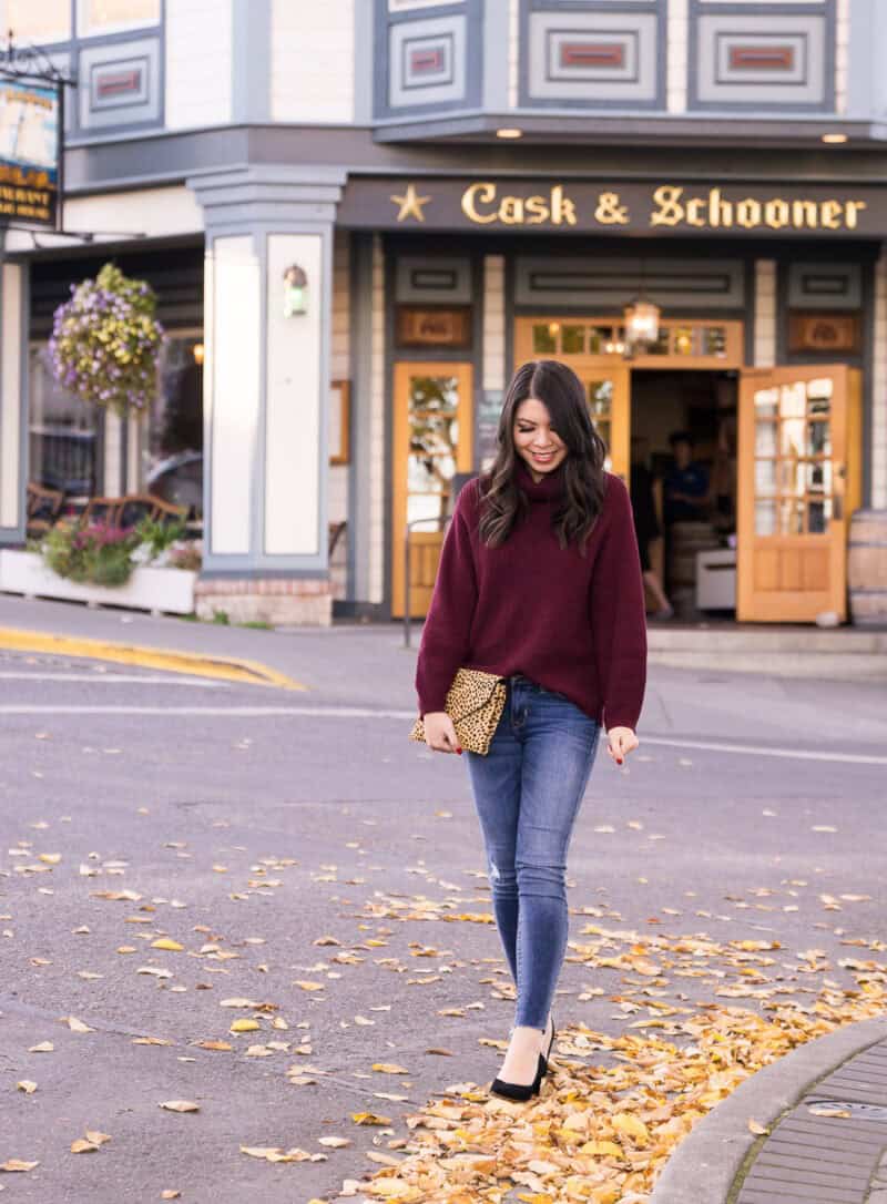 Embrace the quintessential Seattle fall look with this cozy yet chic ensemble. The rich burgundy sweater adds a pop of seasonal color while providing warmth for those crisp PNW days. Paired with classic skinny jeans, this outfit strikes the perfect balance between comfort and style. The leopard print clutch introduces a touch of flair, elevating the look for a night out at local hotspots like Cask & Schooner. Complete the outfit with black pumps for a dressy touch, or swap them for ankle boots to keep it casual. This versatile combination epitomizes Seattle’s laid-back yet fashionable autumn vibe, making it a must-try for your fall wardrobe.