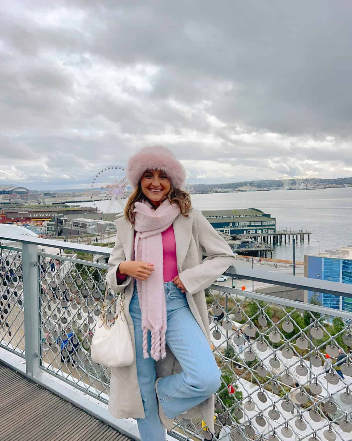 Embrace Seattle’s waterfront charm in this delightful ensemble that perfectly balances cozy and chic. A soft beige coat provides warmth without sacrificing style, while the pink fuzzy hat adds a playful touch that’s perfect for those crisp fall days. The light pink scarf and vibrant pink top inject a pop of color, beautifully complementing the neutral tones. Wide-leg jeans offer both comfort and fashion-forward flair, ideal for strolling along the pier or taking in the views from above. This outfit embodies the laid-back yet put-together essence of PNW style, making it a must-try for anyone looking to capture that quintessential Seattle fall look in .