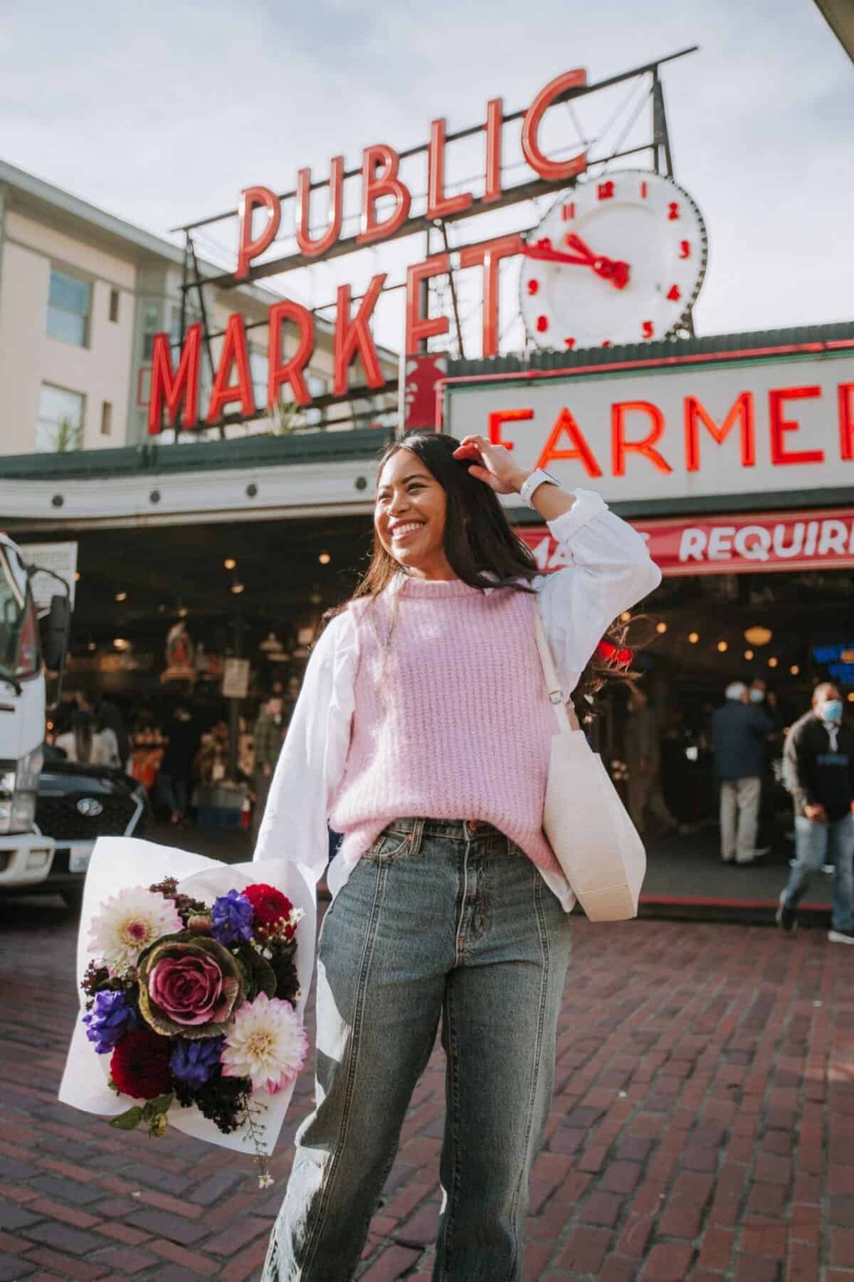 Embrace Seattle’s iconic fall style with this perfectly balanced ensemble. A soft pink knit sweater layered over a crisp white button-down offers warmth and sophistication, ideal for the city’s brisk autumn days. Pair with classic high-waisted jeans for a timeless look that’s both comfortable and stylish. The addition of a roomy white tote is perfect for carrying farmers’ market finds, while a vibrant bouquet adds a pop of color and captures the essence of Seattle’s famous Pike Place Market. This outfit seamlessly blends practicality with urban charm, embodying the laid-back yet fashionable spirit of Pacific Northwest autumn dressing.