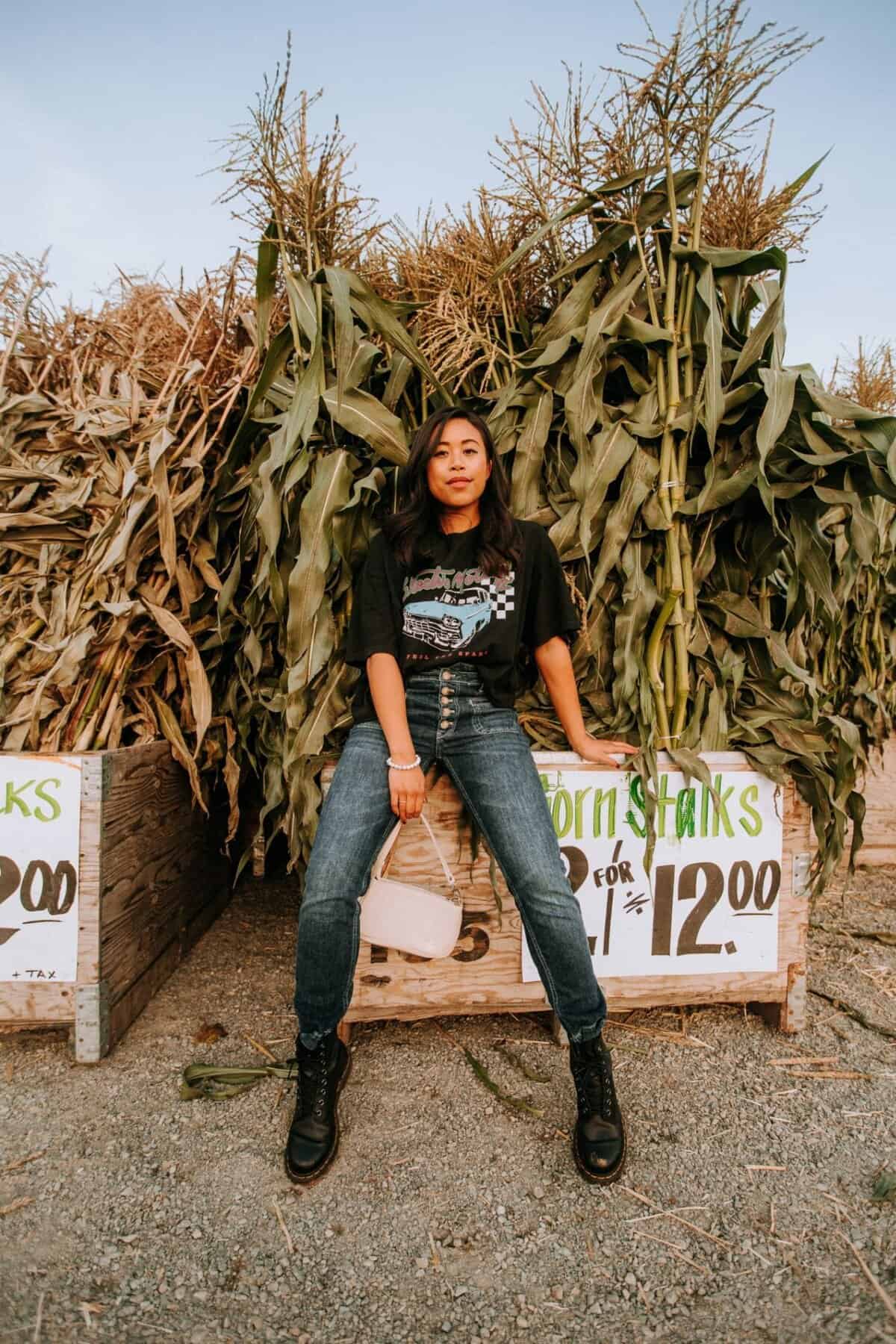 Embrace the essence of Seattle’s fall style with this effortlessly cool ensemble. A vintage-inspired graphic tee paired with high-waisted jeans and rugged combat boots creates the perfect balance of casual and edgy. This outfit is ideal for exploring Seattle’s numerous fall attractions, from pumpkin patches to corn mazes. The dark-hued tee and jeans offer a sleek backdrop for layering with cozy flannels or oversized cardigans as the temperature drops. Accessorize with a small crossbody bag for a touch of practicality. This versatile look embodies the laid-back yet fashion-forward spirit of PNW autumn style, making it a must-try for Seattle’s crisp fall days.