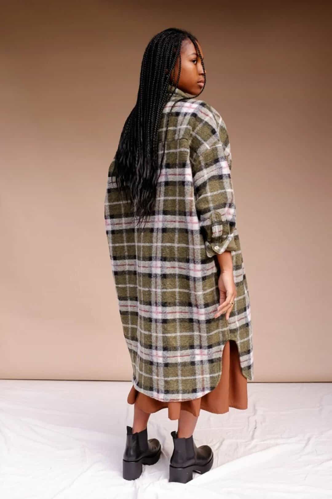 Embrace the quintessential Pacific Northwest style with this cozy oversized plaid shacket. The olive green and pink plaid pattern perfectly captures the essence of Seattle’s fall palette, while the roomy silhouette allows for effortless layering over sweaters or dresses. This versatile piece transitions seamlessly from crisp morning walks to evening bonfires. Paired with a rust-colored midi skirt and chunky ankle boots, it creates a balanced look that’s both fashion-forward and practical for Seattle’s unpredictable autumn weather. The shacket’s generous length provides extra warmth and style, making it an indispensable addition to any PNW fall wardrobe.