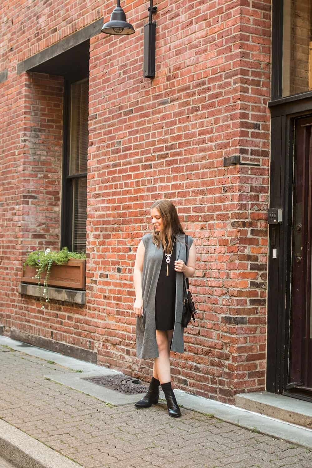 Embrace Seattle’s unpredictable fall weather with this versatile and chic ensemble. The long gray vest adds a sophisticated layer over a simple black dress, creating a look that’s both polished and practical for the Pacific Northwest. Paired with ankle boots, this outfit strikes the perfect balance between style and comfort, ideal for navigating Seattle’s urban landscape. The neutral color palette reflects the city’s subdued autumn tones, while the long pendant necklace adds a touch of elegance. This ensemble effortlessly transitions from a day at the office to an evening at a trendy Capitol Hill restaurant, embodying the laid-back yet fashionable spirit of Seattle’s fall style.
