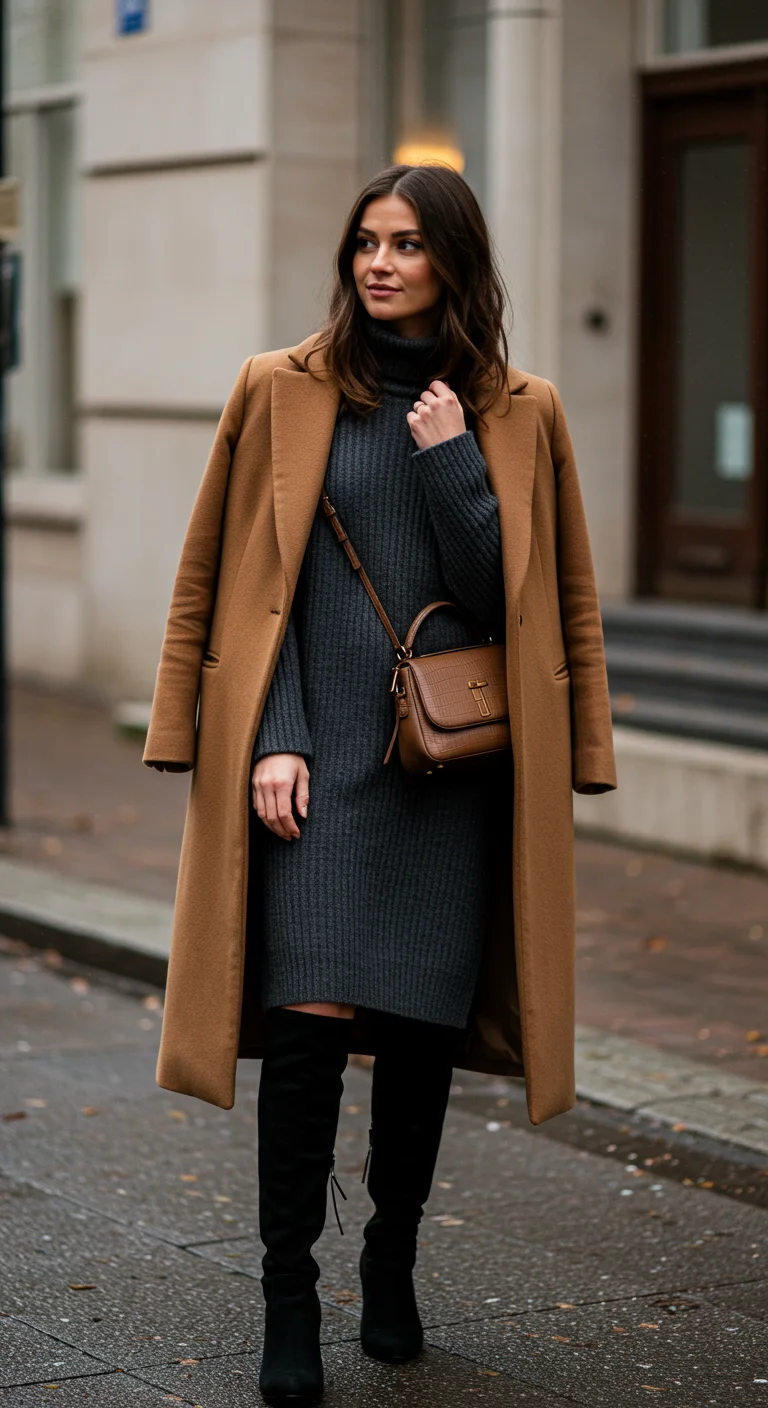 Layer with a long camel coat and pair with knee-high black boots for a polished finish.