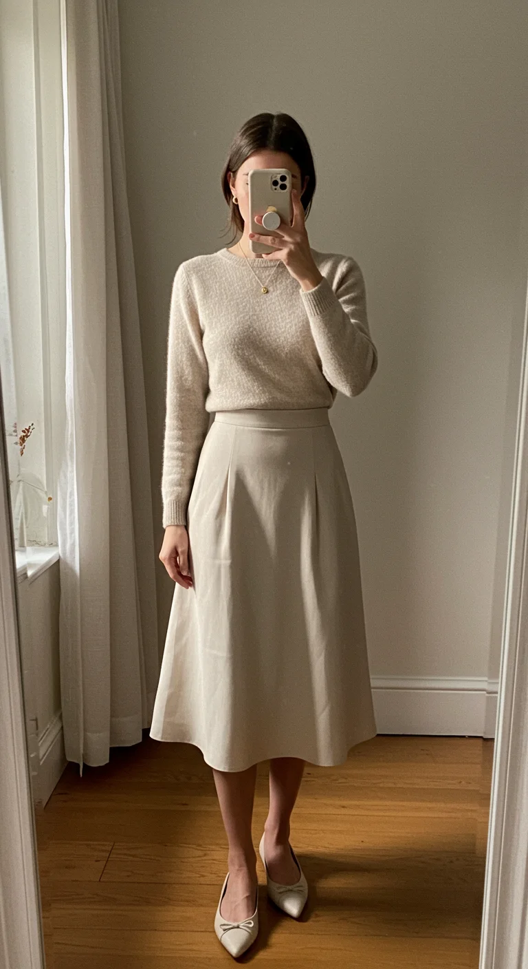 A high-waisted A-line skirt creates a flattering silhouette. A delicate gold necklace adds a subtle sparkle.