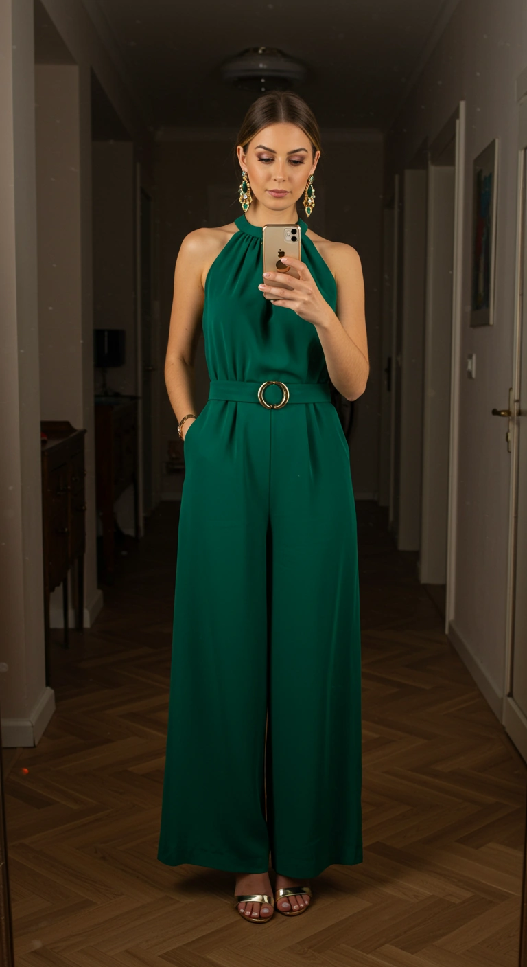 Make a statement in a floor-length halter neck jumpsuit. The rich emerald green color exudes luxury and confidence.