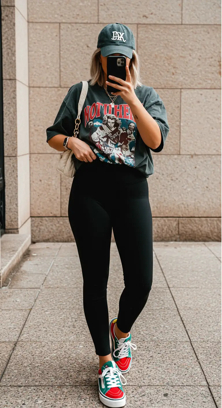Combine comfort and style with black high-waisted leggings and an oversized graphic tee.