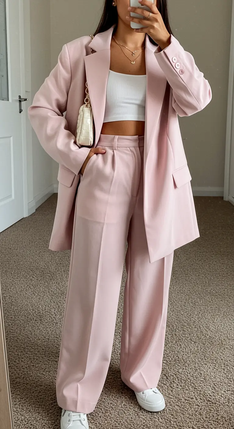Make a statement in a pastel pink oversized blazer and matching wide-leg trousers.