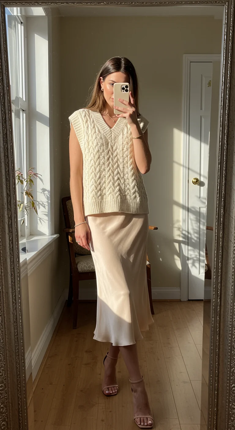 Layer a cream cable knit vest over a white t-shirt and pair with a light pink silk midi skirt.