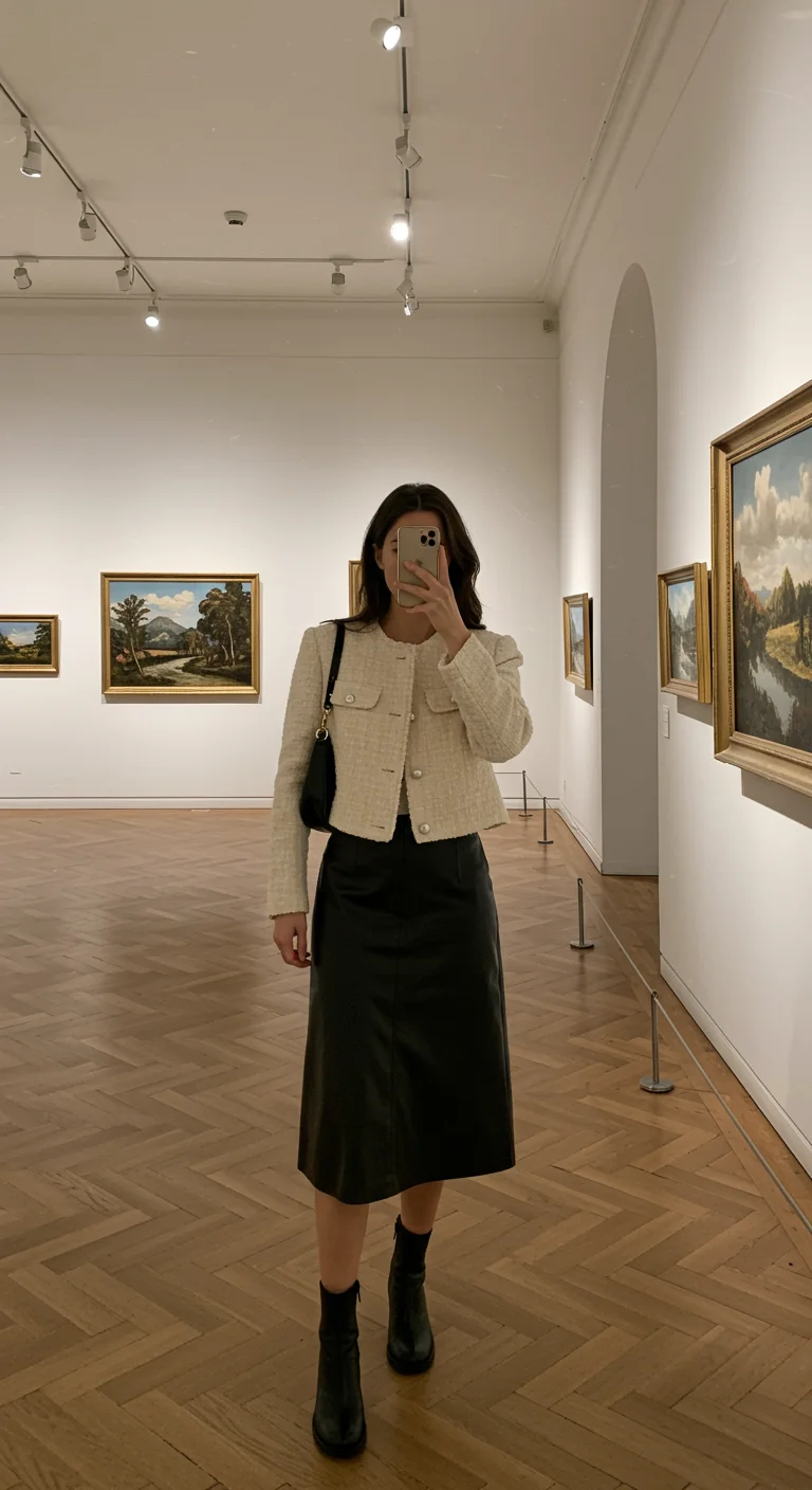 This edgy-meets-preppy ensemble is ideal for gallery openings or dinner dates.