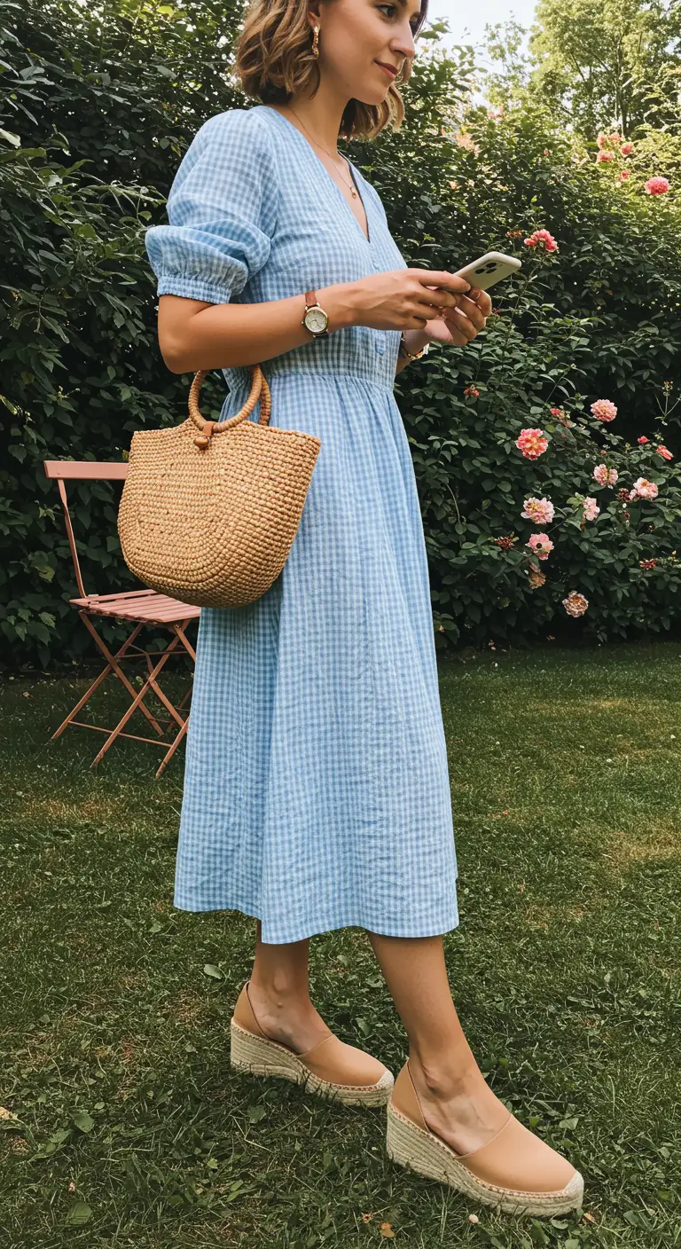 Don a knee-length blue gingham dress cinched at the waist with a thin belt.