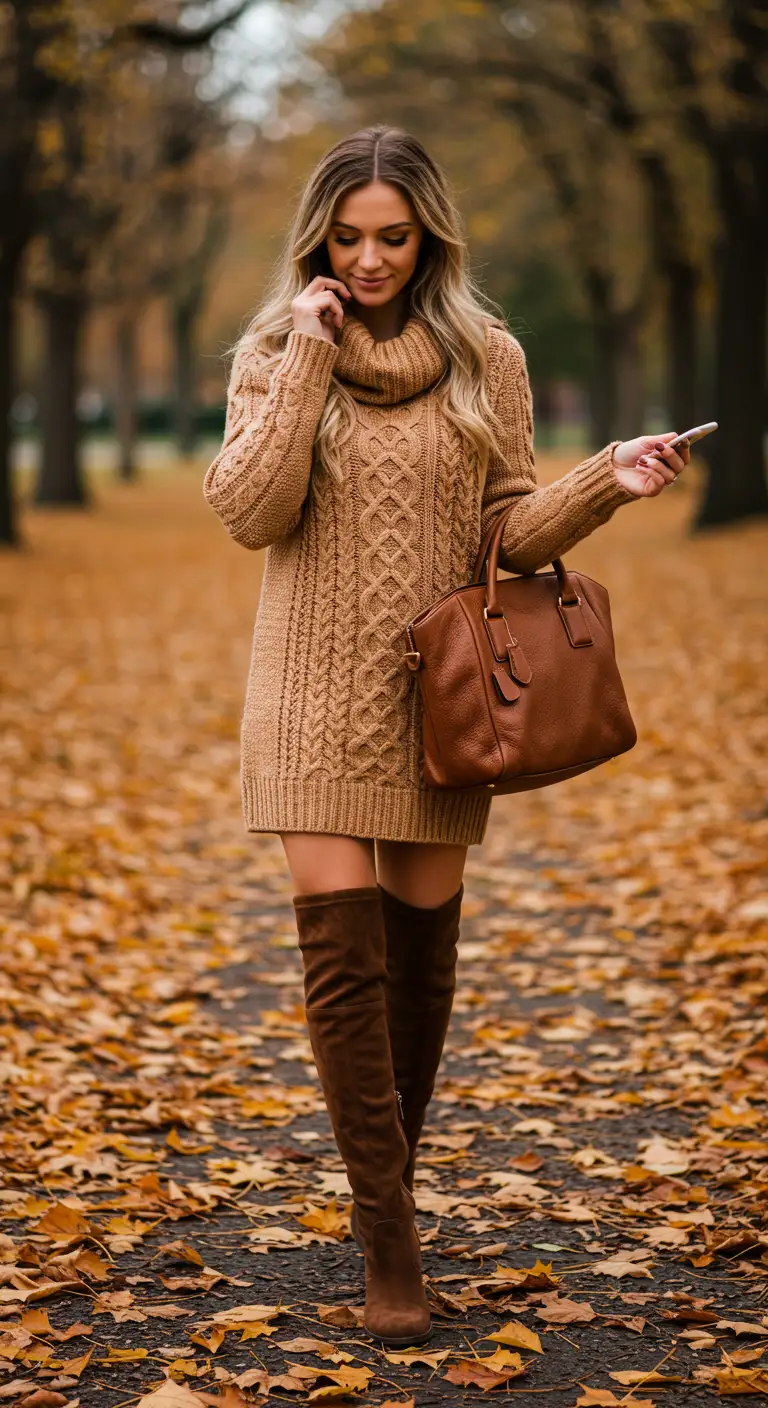 Cozy up in a camel cable knit sweater dress paired with dark brown knee-high boots.