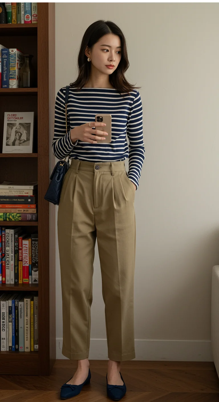 Opt for a classic navy and white striped boatneck top tucked into high-waisted khaki trousers.