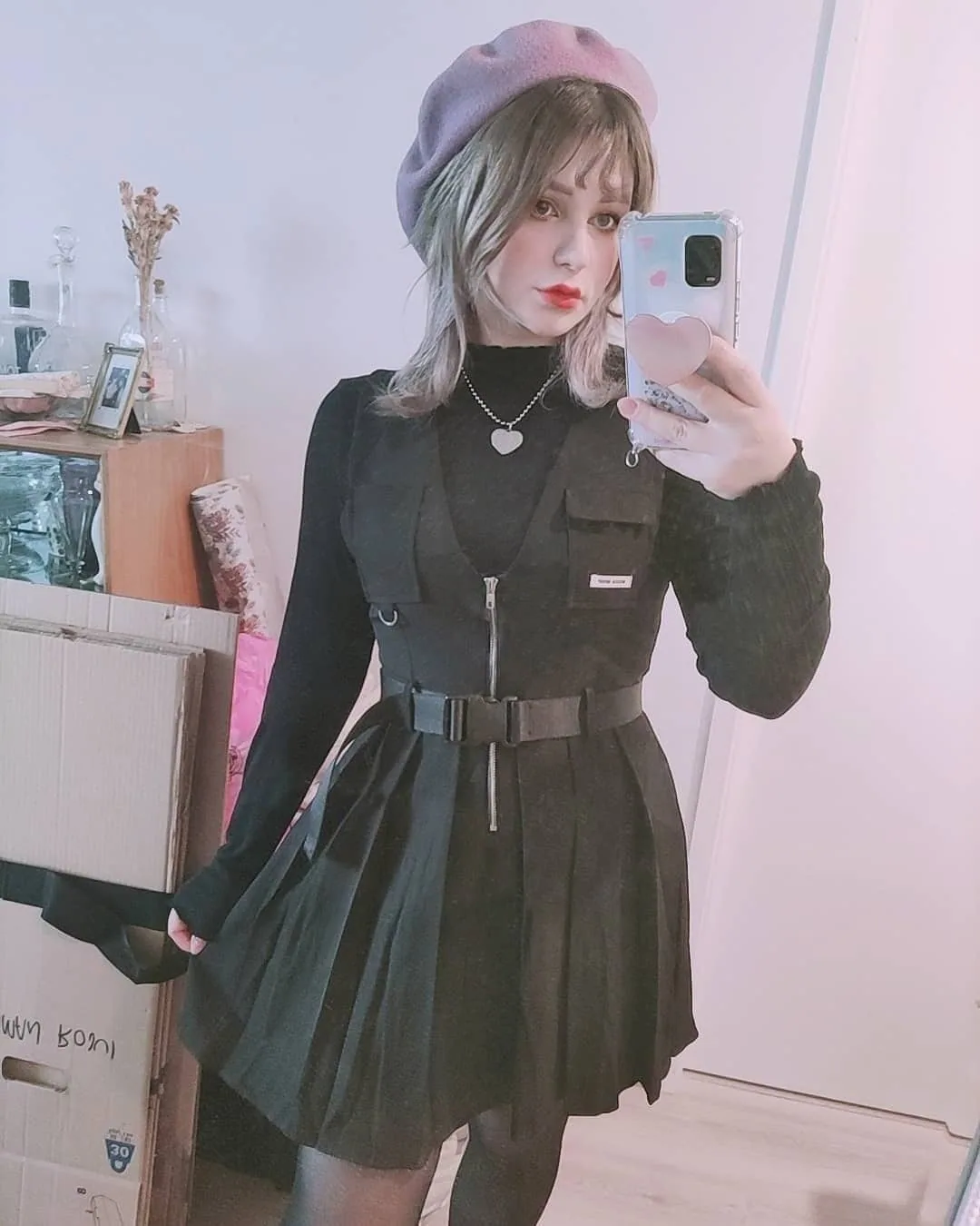 This outfit seamlessly blends preppy and edgy elements for a unique campus style. The black belted dress with its structured silhouette and pleated skirt offers a sophisticated base, while the lilac beret adds a playful, Parisian-inspired touch.