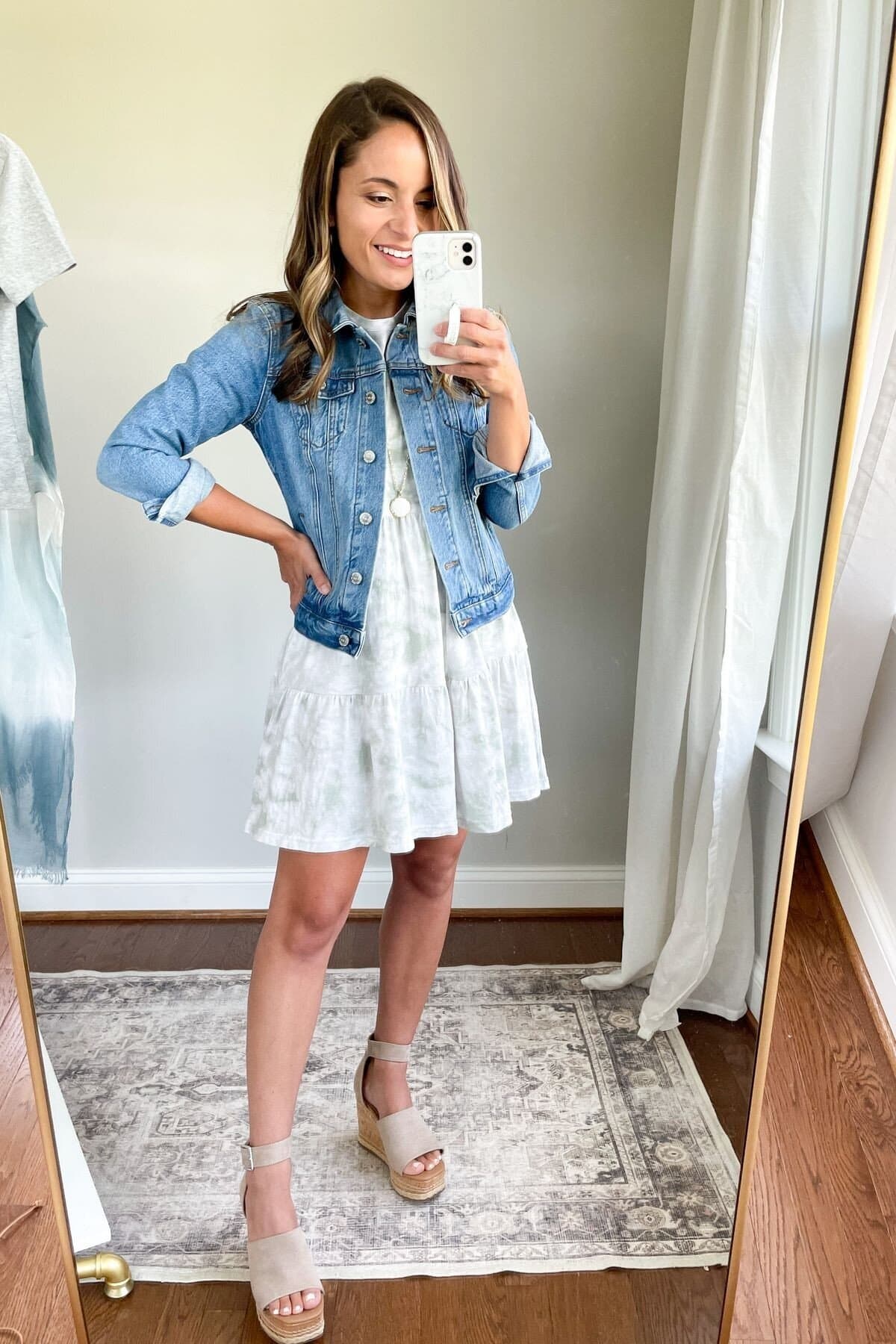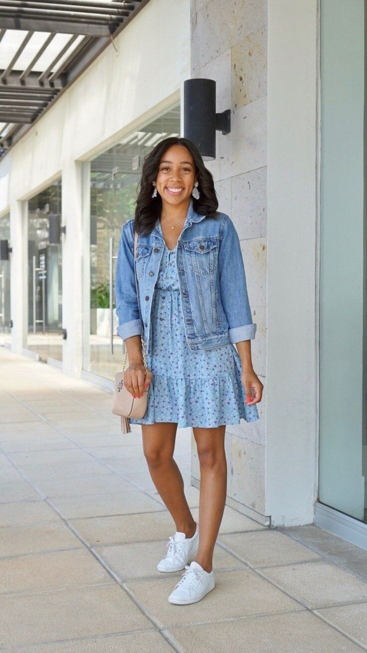 The denim jacket adds a touch of ruggedness to the feminine silhouette of the dress, while the neutral color palette keeps the look fresh and versatile. Paired with wedge sandals, this outfit transitions seamlessly from lectures to lunch dates.