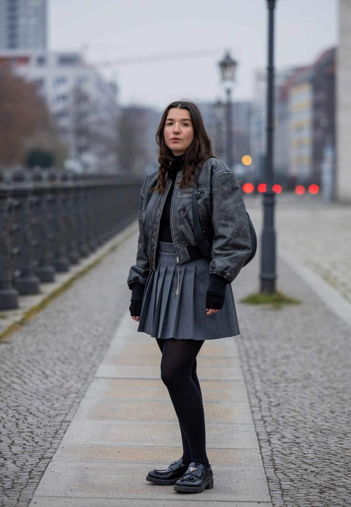 Paired with a distressed leather jacket, the outfit strikes a perfect balance between polished and punk. The addition of opaque black tights and chunky loafers maintains the scholarly vibe while adding a touch of grunge.