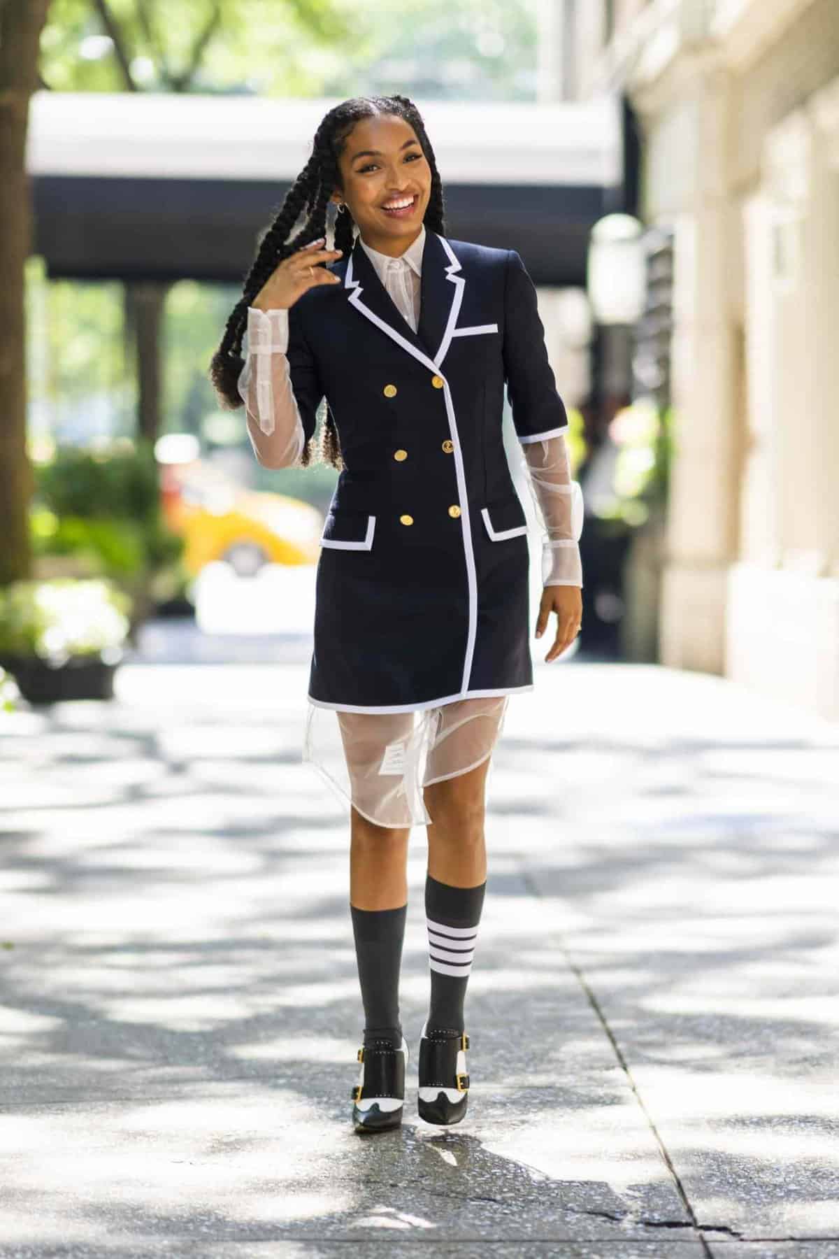 This ensemble epitomizes preppy chic with a modern twist, perfect for making a stylish statement on campus. The black blazer dress, adorned with contrasting white piping and gold buttons, exudes classic sophistication.