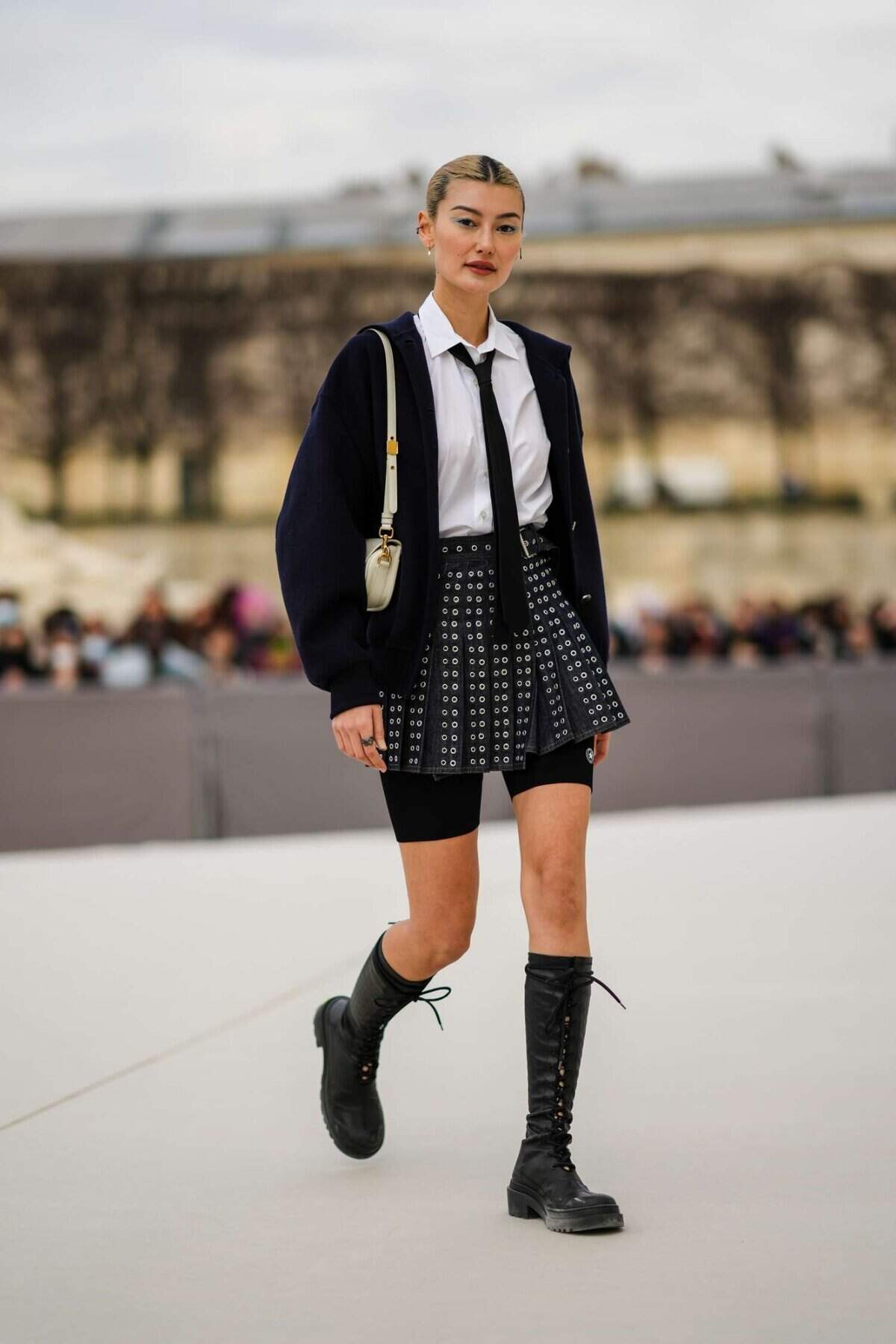 However, the addition of a black tie and an eye-catching studded skirt over bike shorts adds a rebellious flair. The look is completed with chunky combat boots, striking a balance between academia and urban edge.