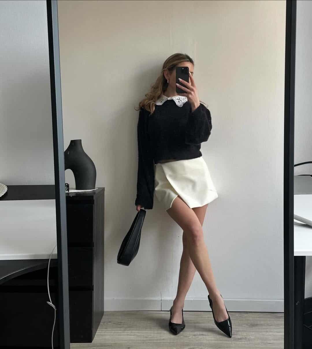 Paired with a crisp white mini skirt, it creates a striking monochrome look thats both classic and contemporary. The outfit is completed with sleek black pumps and a matching handbag, demonstrating attention to detail in accessorizing.